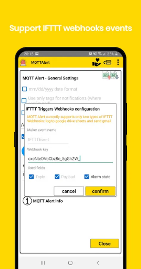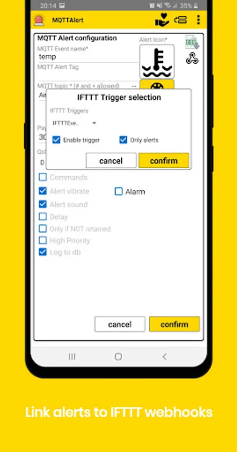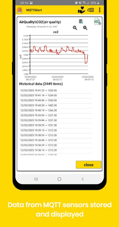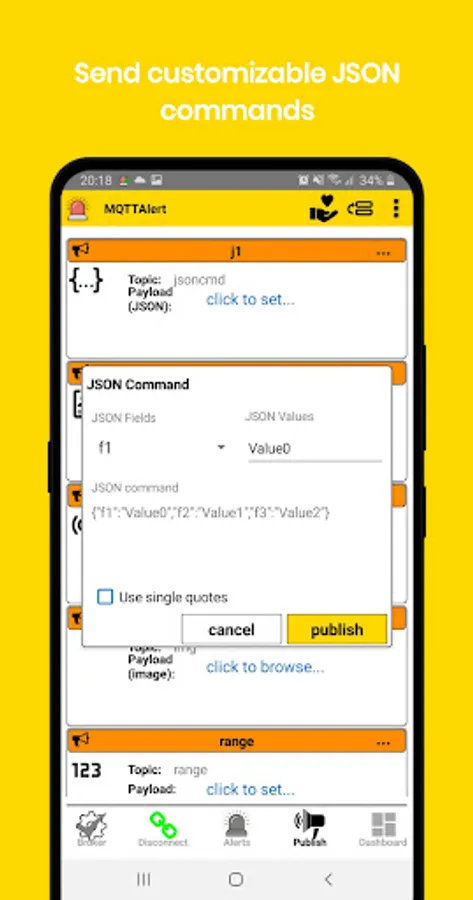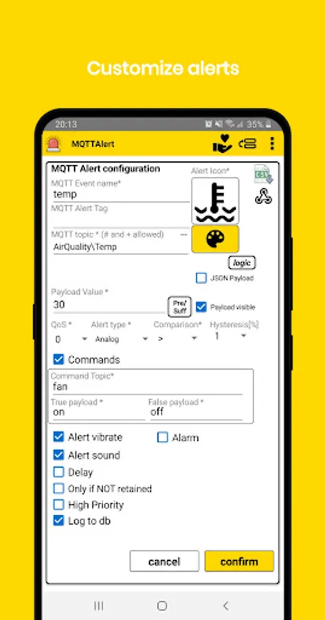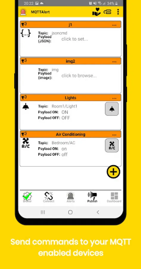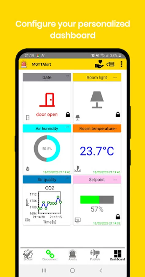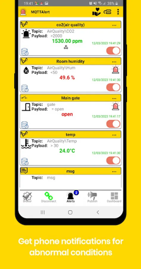 MQTTAlert app is an MQTT client that allows you to monitor your devices for configurable conditions (door open,temperature > x degrees, etc). When the condition is met you will get a phone notification or a phone configurble sound alarm. Each received MQTT message is stored in a local database that can also be exported to csv file for analysis. Analog payloads are also displayed as time series. One can also configure each alert to publish commands depending on the alert status. For example you could publish an MQTT command that switch on a fan when the temperature is higher than a specified value and switch it off when it is below (with configurable hysteresis). Commands can also be published manually from the UI in different formats including images. JSON payloads and published commands are fully supported including nested fields and arrays. Wildcards for topics are fully supported for flexible alerts or messages configuration for multiple devices MsgPack is supported. Dashboard is now available and the app can now integraste some IFTTT events to be linked to alerts.
