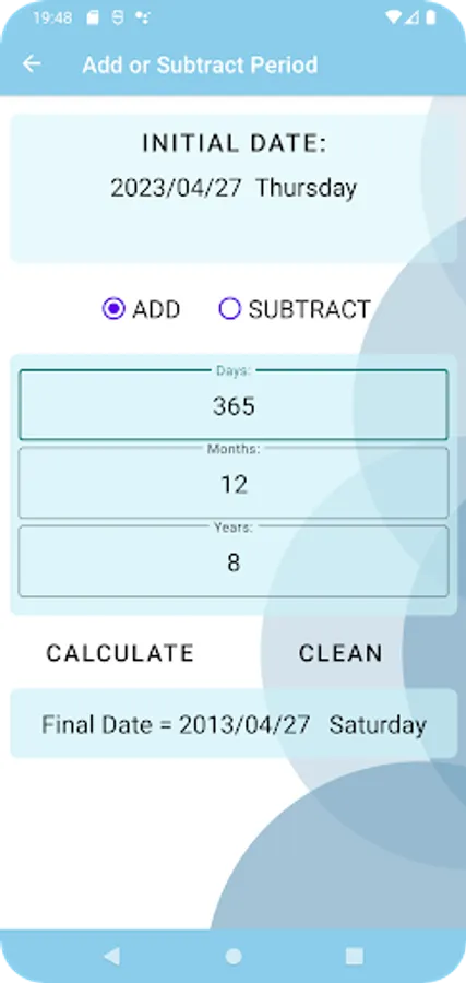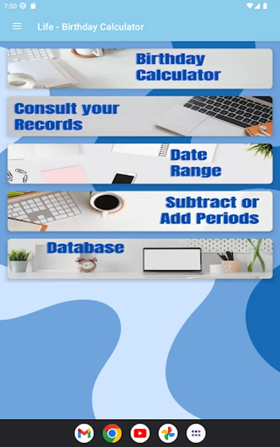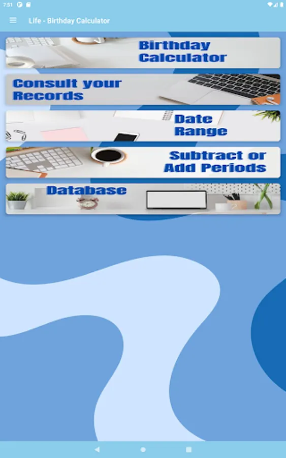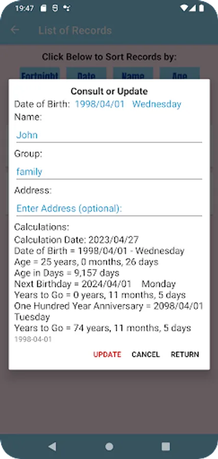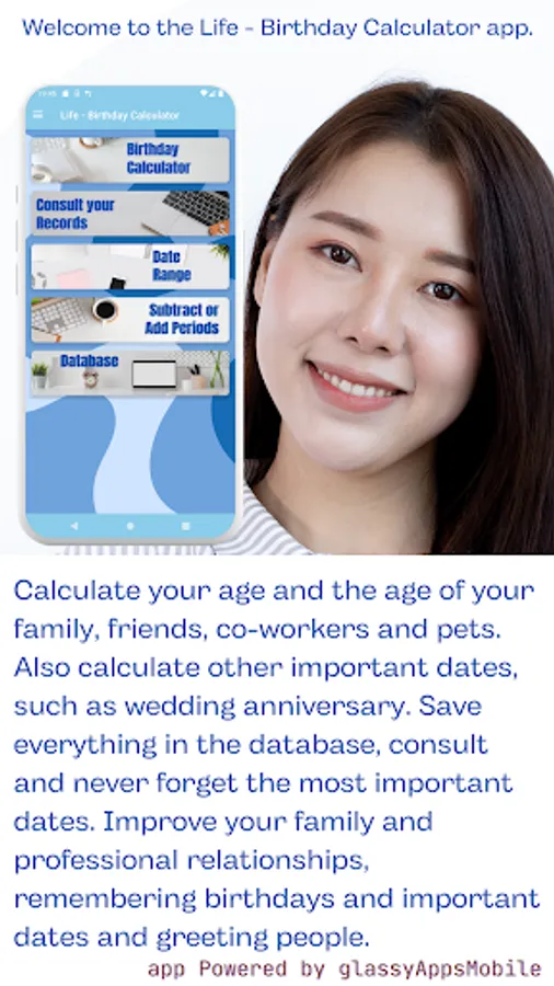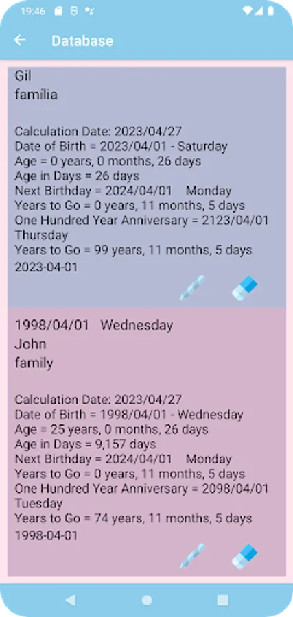 Calculate your age and the age of your family, friends, co-workers and pets. Also calculate other important dates, such as wedding anniversary. Save everything in the database, consult and never forget the most important dates. Improve your family and professional relationships, remembering birthdays and important dates and greeting people.