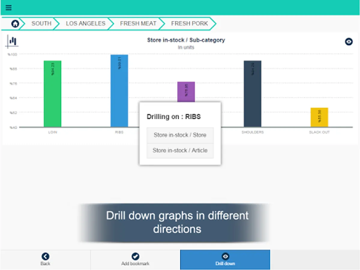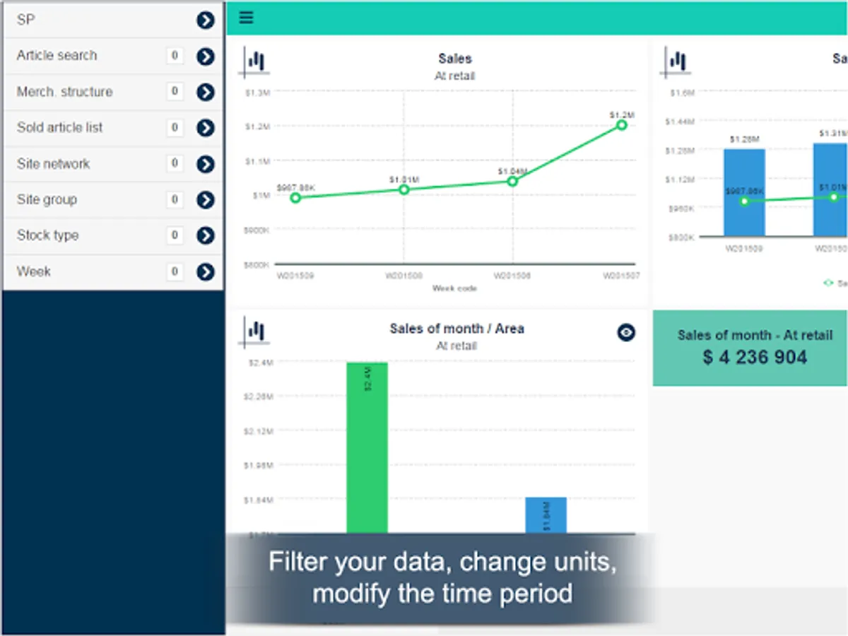 - Intuitive drill down on time period (year / quarter / month / week / day), geographical network (country / region / city / store) or merchandise structure (category, shelf group, classification, article)