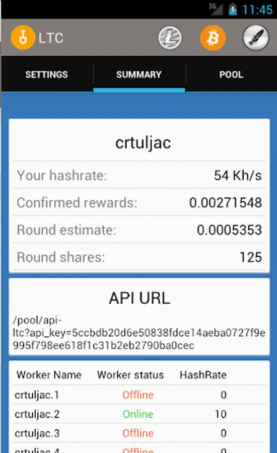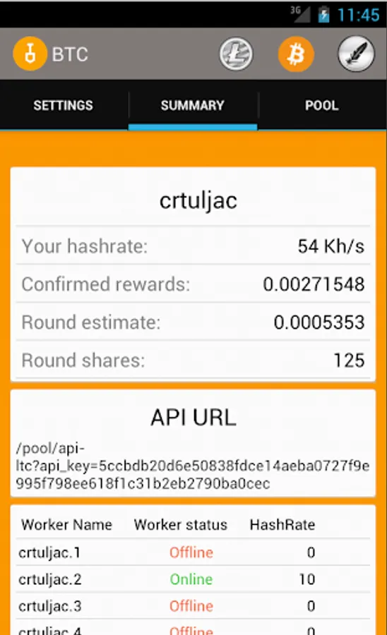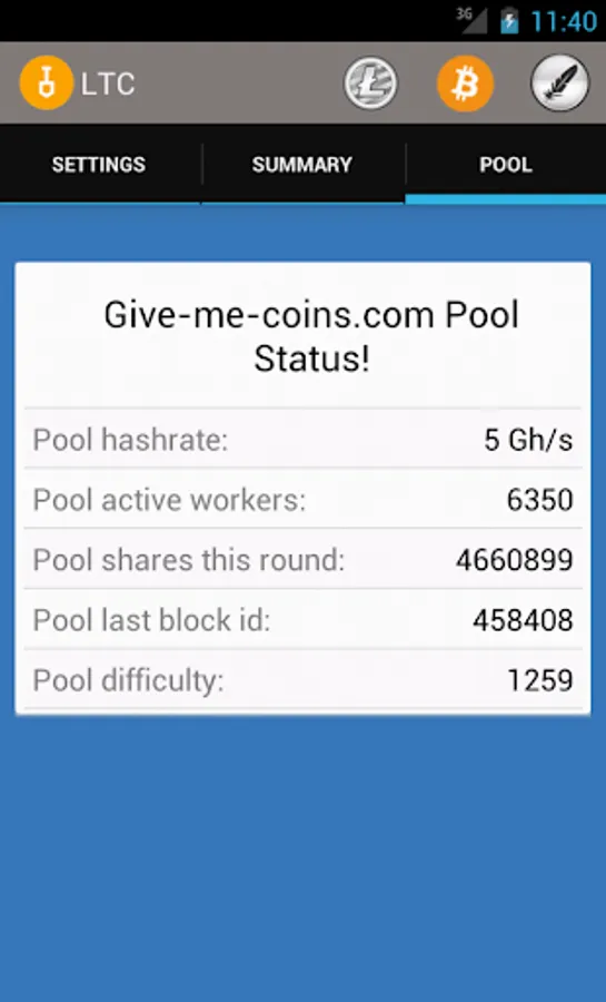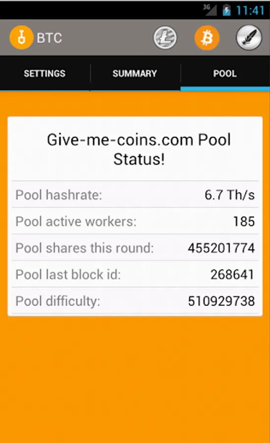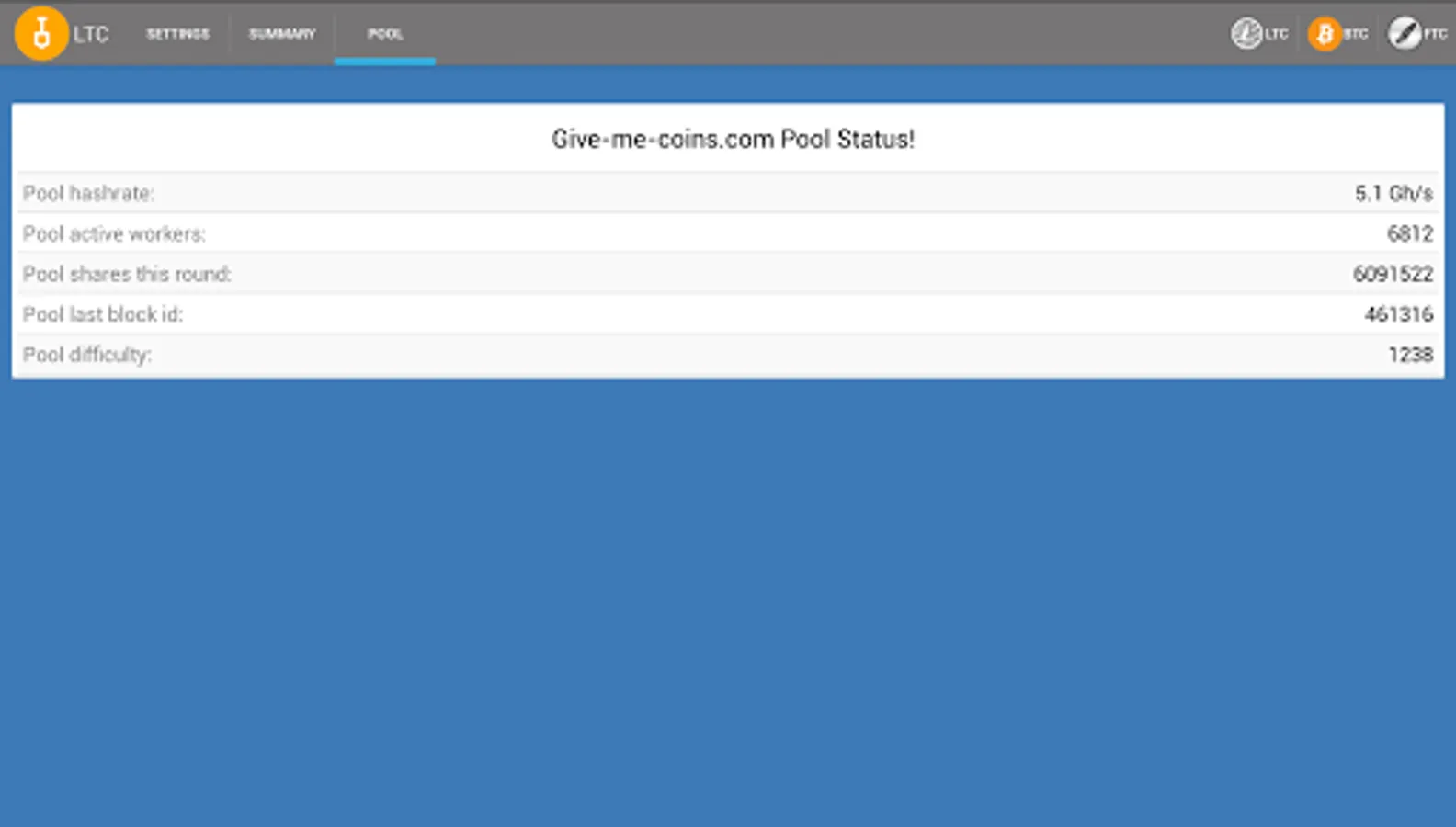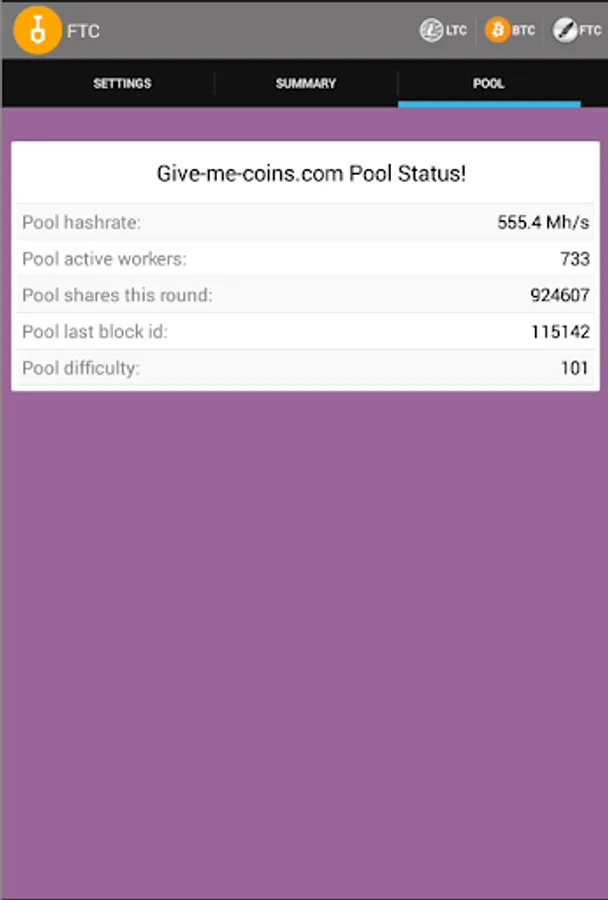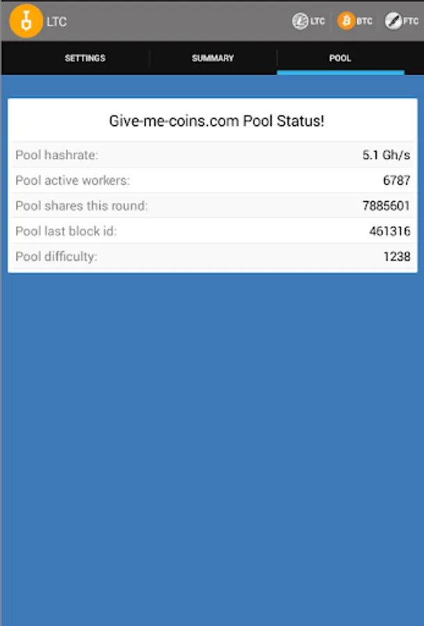 This is BTC, LTC, FTC, VTC and PPC Monitoring app for pool give-me-coins.com . Now you can watch your hashing performance for all your favourite cryptographic currencies (BitCoin, LiteCoin, FeatherCoin, VertCoin and PeerCoin) from your Android phone. App has gone through beta testing and we will continue to fix bugs as soon as possible. Every rating and comment is highly appreciated and will enable us to improve application according to our users needs.