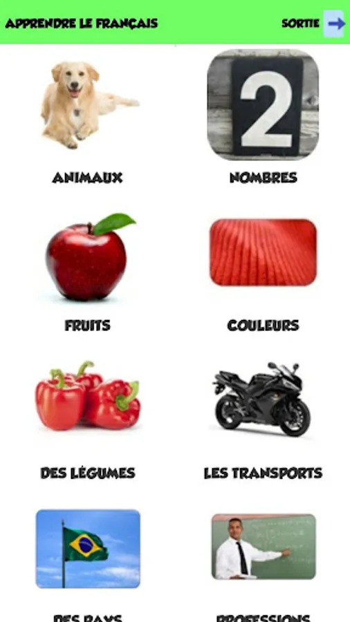 Game 1: One random picture from the selected category is displayed and you are asked to select the correct French word from the options.