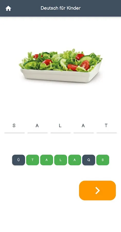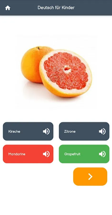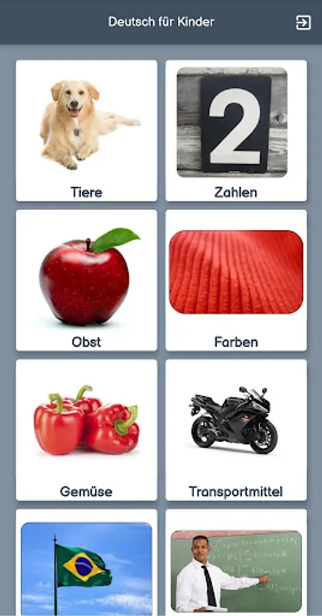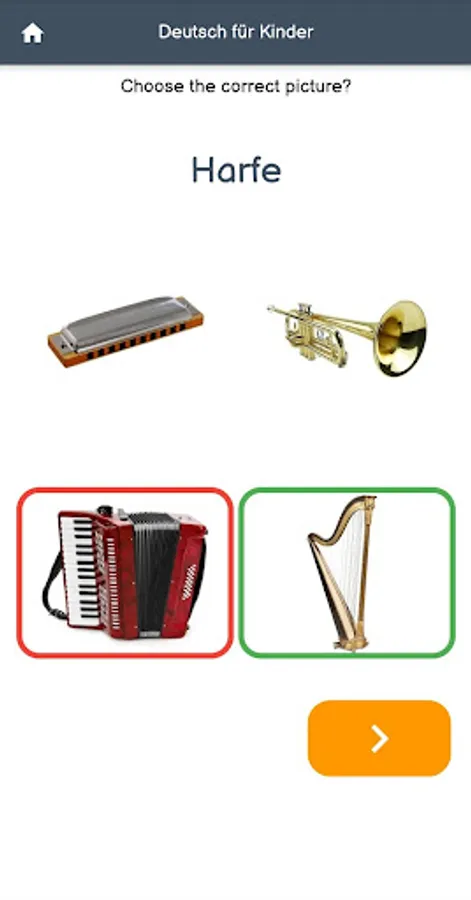 Game 2: One random German word from the selected category is displayed and you are asked to select the correct picture from the options.