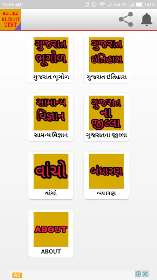 All topic question, gujarat bhugol, gujarat itihas, gujrat no varsho, bharat nu bandharan,samany gyan,gujarat na jilla,gandhiyog na aandolan,sankrutik varso, gk. This app into Provide All Gujarati language and All question Step by Step Index This app is very easy to use Index wise Details...Enjoy Now G.K GUJARATI TEST