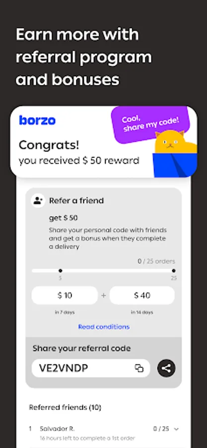 Borzo offers diverse bonus programs to help you get even more money for your driving job. Invite your friends to join our courier team, earn extra points, and receive tips — with Borzo, everything is possible. There’s no limit to your income!