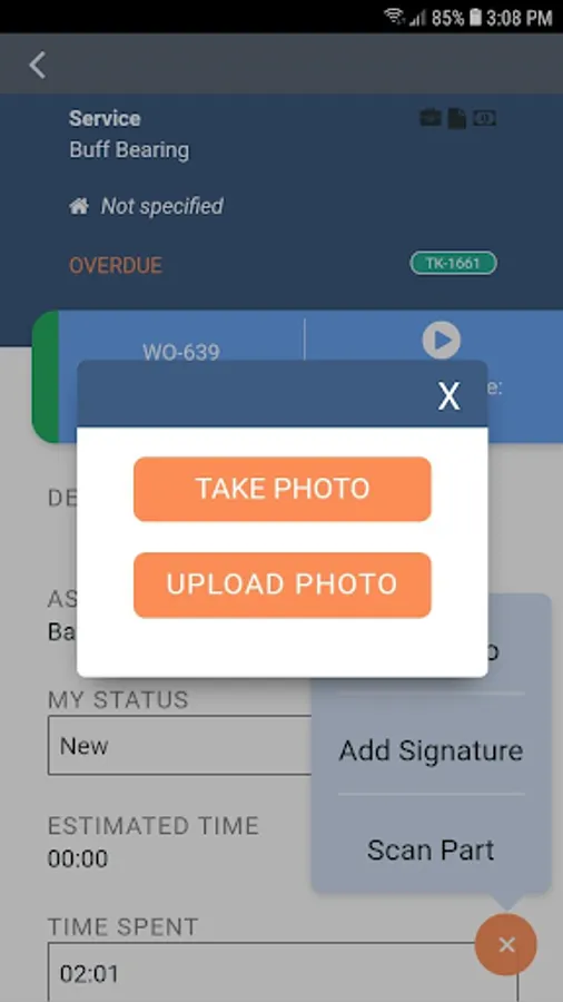 - Use the barcode scanner to record parts used, or select parts used from the available inventory.