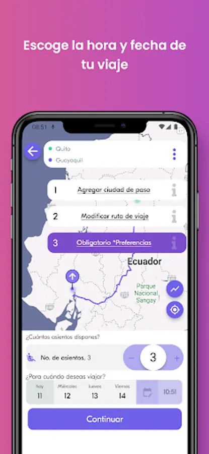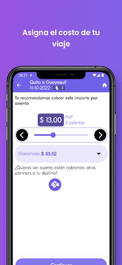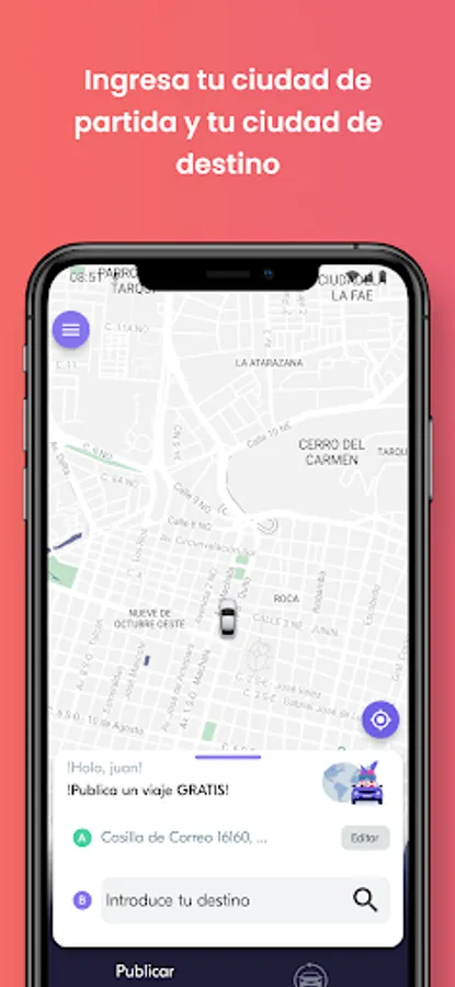 Are you going to leave the city and have positions available in your vehicle? Perfect! Publish your trip choosing your place of departure, your transit city and your destination, choose the preferences for your trip (price per seat, pets, smokers, luggage size, etc.) and we will offer your "plan" so that our users accompany you for the published price. Become the "planner" with the best rating and comments. Have fun, drive respecting the traffic rules, earn money and make friends.