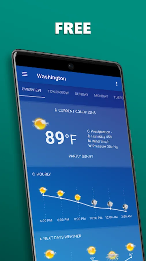 The weather application contains basic information about the current conditions and the forecast for the next days presented in a clear and simple way. Basic weather information: