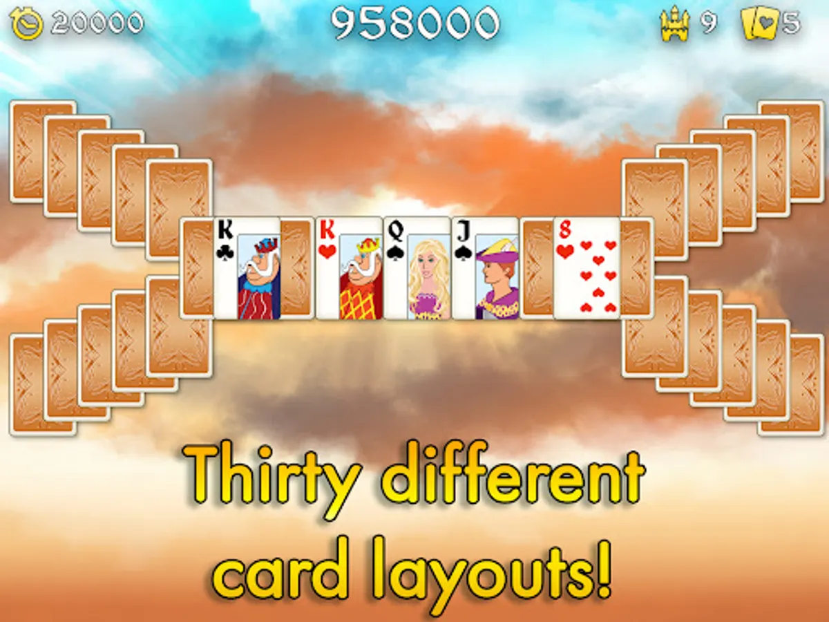 To win a round in the classic layout all you have to do is remove all three peaks (or pyramids) of cards by matching cards that are one higher or lower than your current deck card. You don't need to match them by their suits. If you can't make a move, simply turn over a card from the deck. Win as many rounds as you can to get the highest score. Different levels present slightly different challenges each designed to delight you.