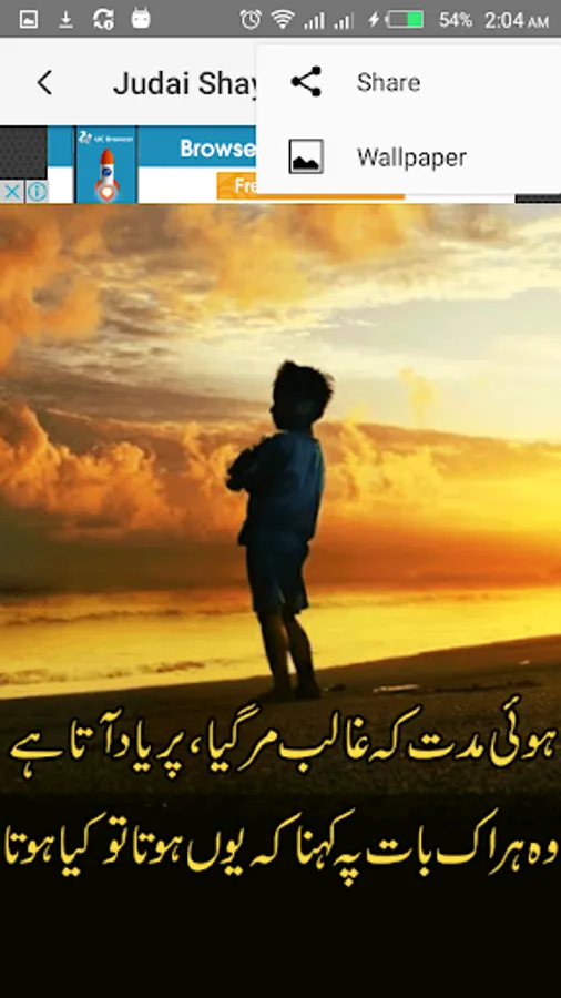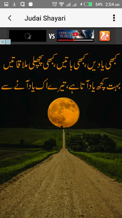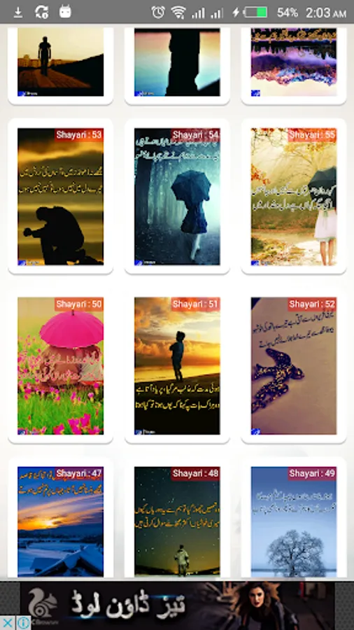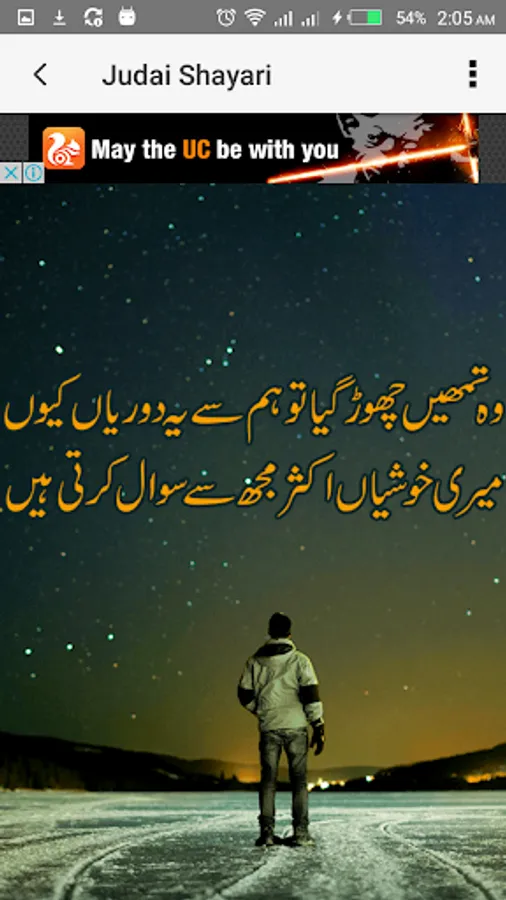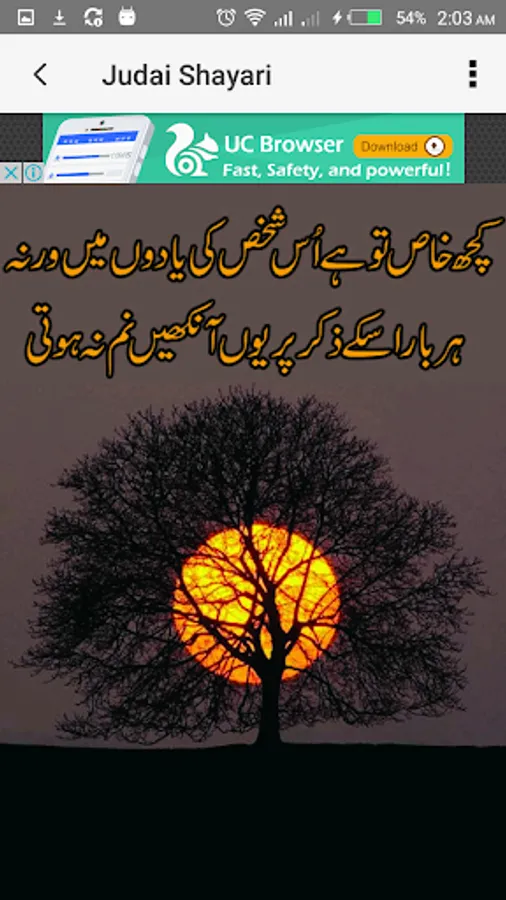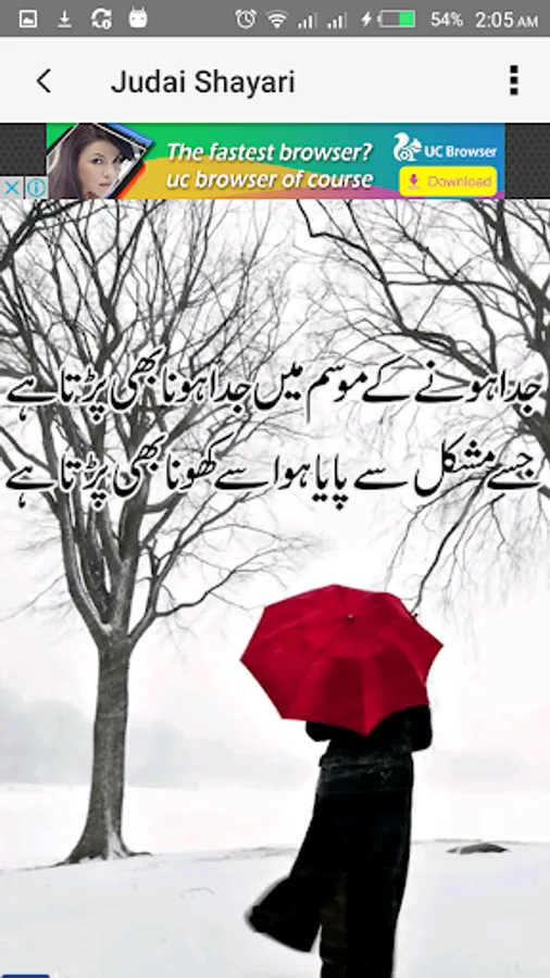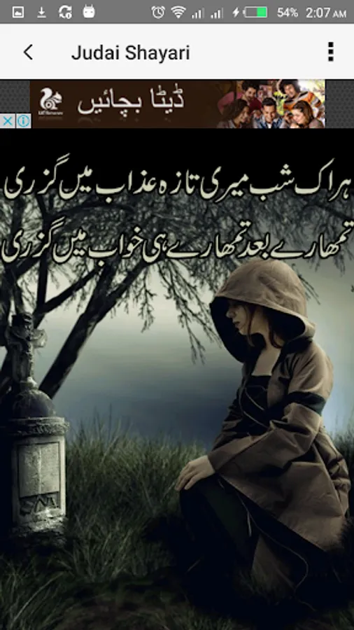 Collection of best Judai Urdu Shayari which you ever read in you life. We provide a simple & elegant way to share Urdu Judai Shayari (Poetry) with your lovers and friends. In this application there is a huge collection of Judai Urdu Shayari (Poetry) in Urdu.