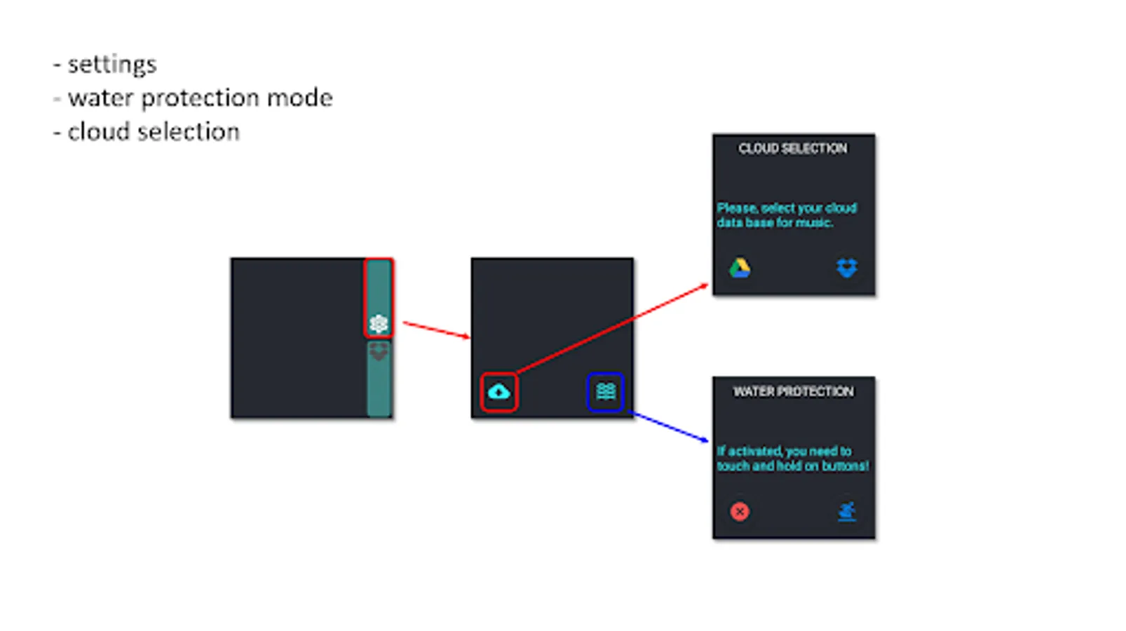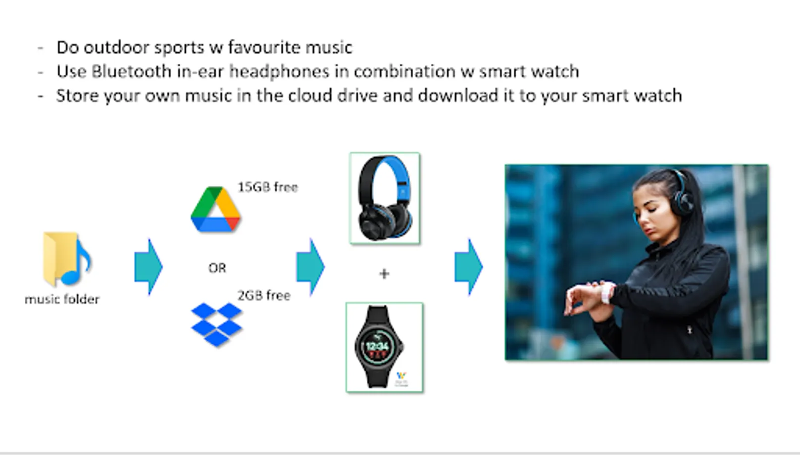 Use your space on google drive or drop box for storing the music files. Download the songs to the smart watch and hear music, by connecting any audio device via Bluetooth. The app is independent from smart phone. Internet connection is mandatory for download. It can be ensured by WiFi router or through the connected smart device w internet access or even w a SIM card in the watch, if supported.