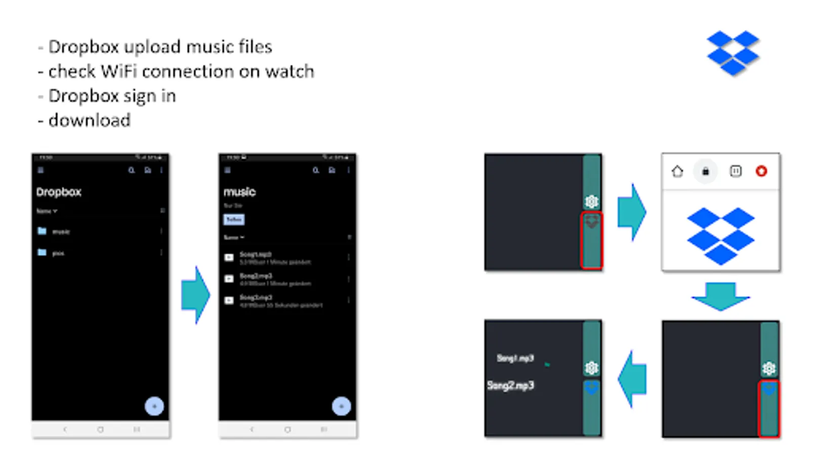 Some smart watches didn't get updated to Wear OS by OEM, f.e. Sony Smart Watch SWR50. There is no easy way to activate google account on this watch. But, the Dropbox API works well on it. The prerequisites, which need to be met are 1. install a web browser 2. install a keyboard. Both applications can easily be found outside the Play Store.