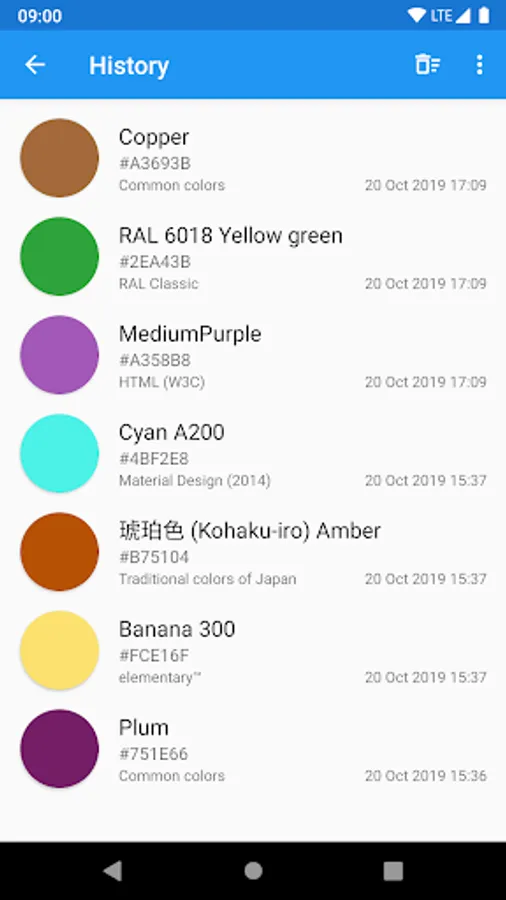 Identify color from several color palettes. The app database contains more than 1000+ entries from the most famous color palettes: Common colors, RAL Classic, HTML (W3C), Material Design and others. Not sure which palette to choose? Use the universal palette "Common colors", which contains all the most famous colors.