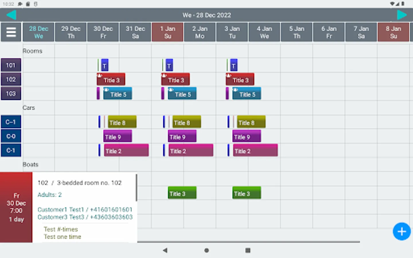 Business system to manage customer reservations/booking for hotel, pension car rental, hire service etc. . Data presentation prepared especially for small and large touchscreens. Easy management of customer groups, own resources/services (like hotel room, cars for hire etc.).