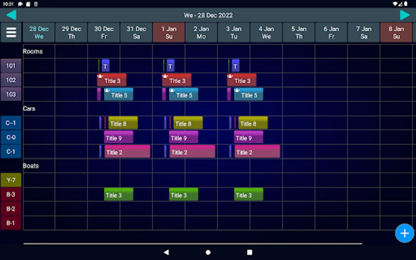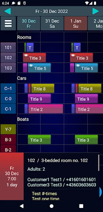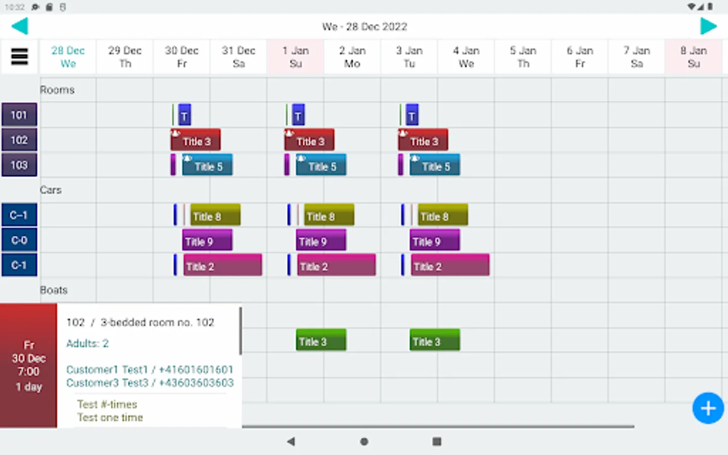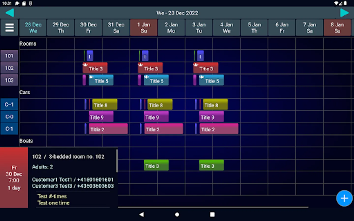 Business system to manage customer reservations/booking for hotel, pension car rental, hire service etc. . Data presentation prepared especially for small and large touchscreens. Easy management of customer groups, own reservable resources/services (like hotel room, cars for hire etc.).