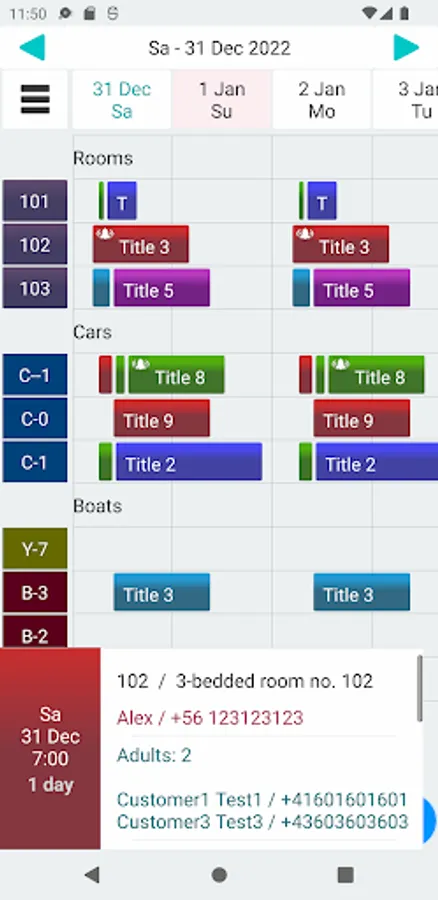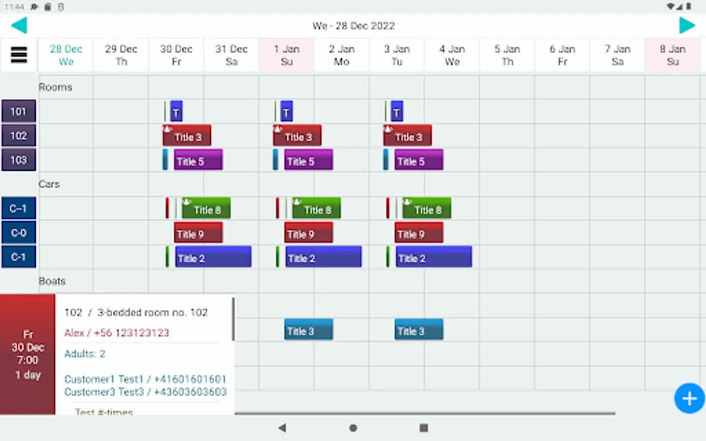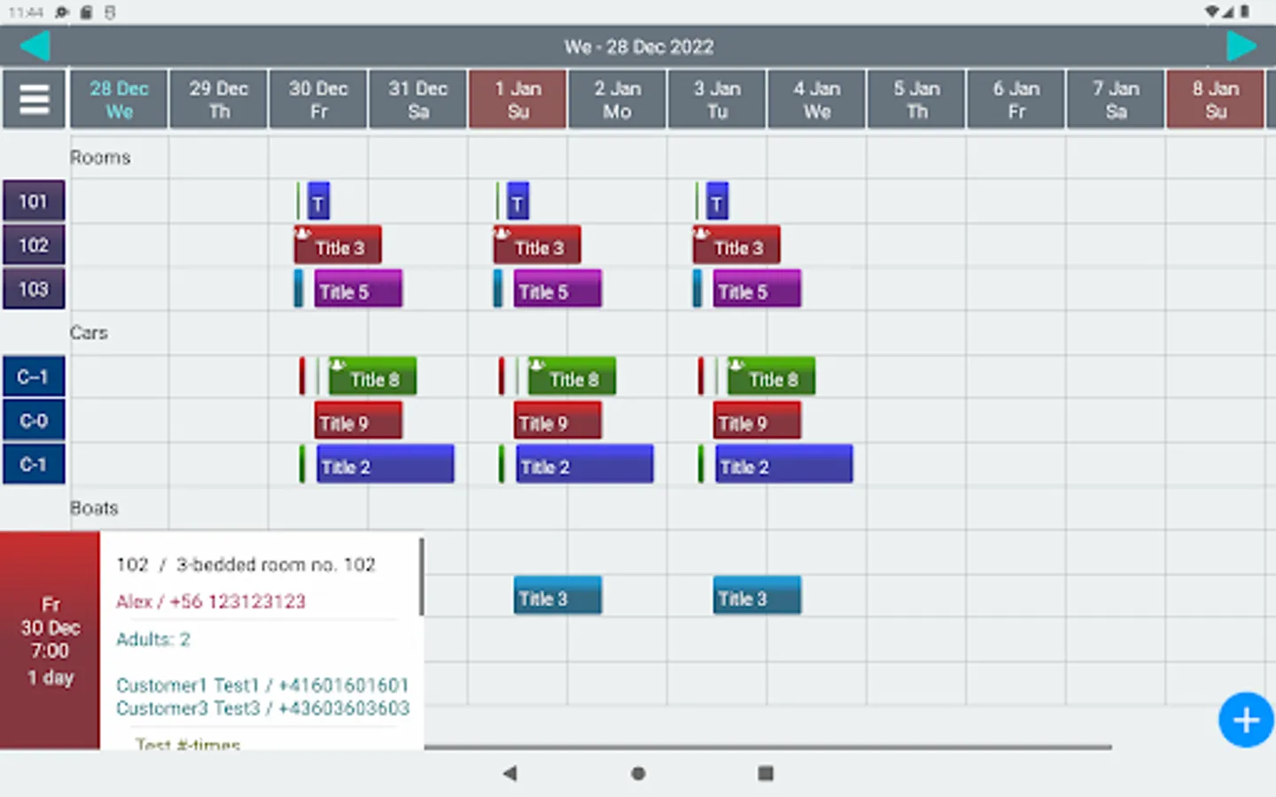 Business system to manage customer reservations/booking for hotel, pension car rental, hire service etc. . Data presentation prepared especially for small and large touchscreens. Easy management of customer groups, own resources/services (like hotel room, cars for hire etc.).