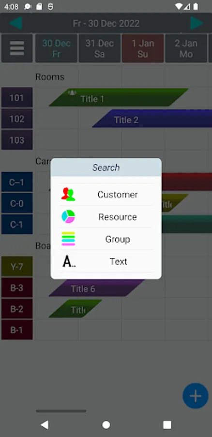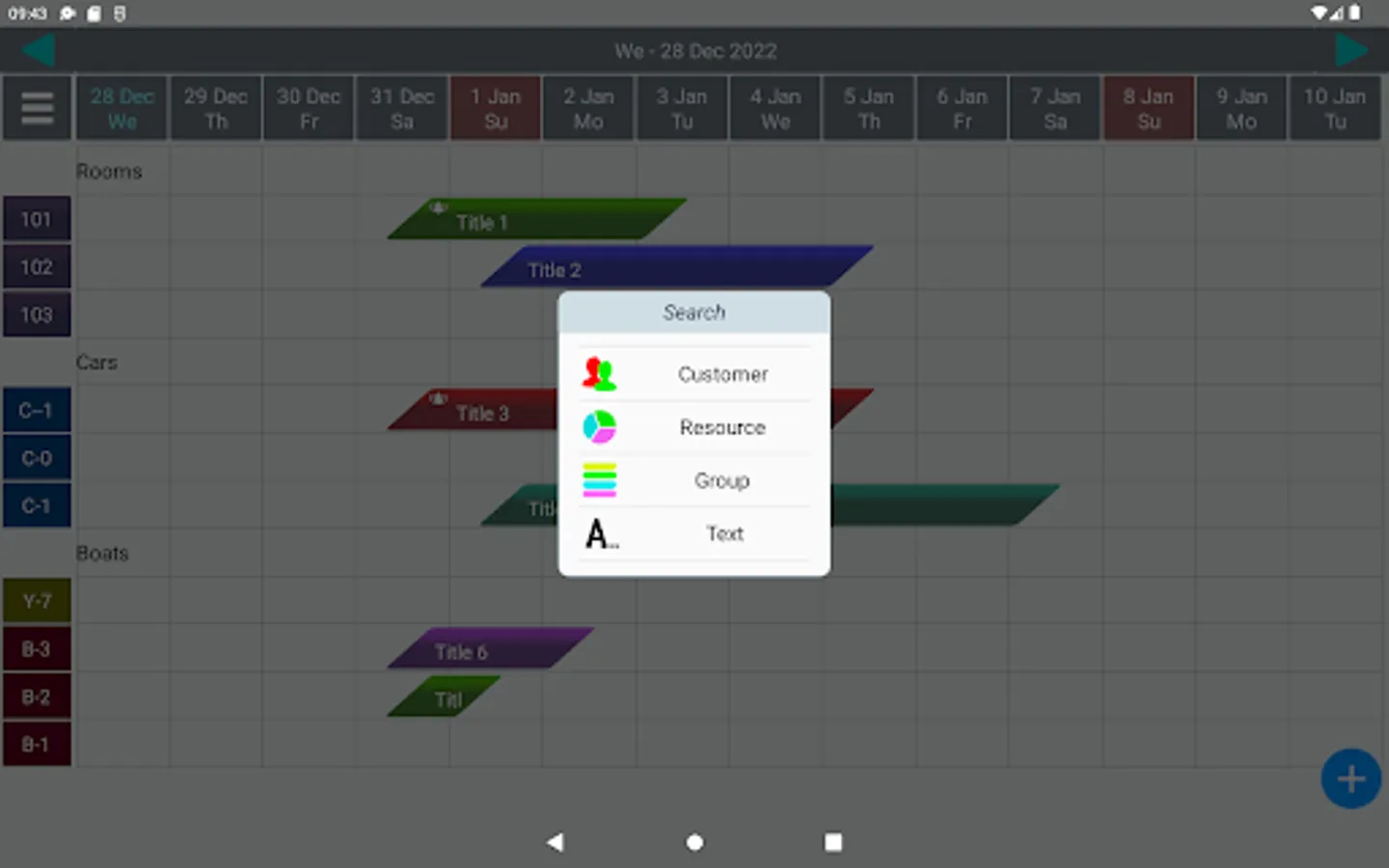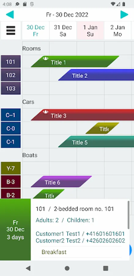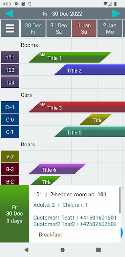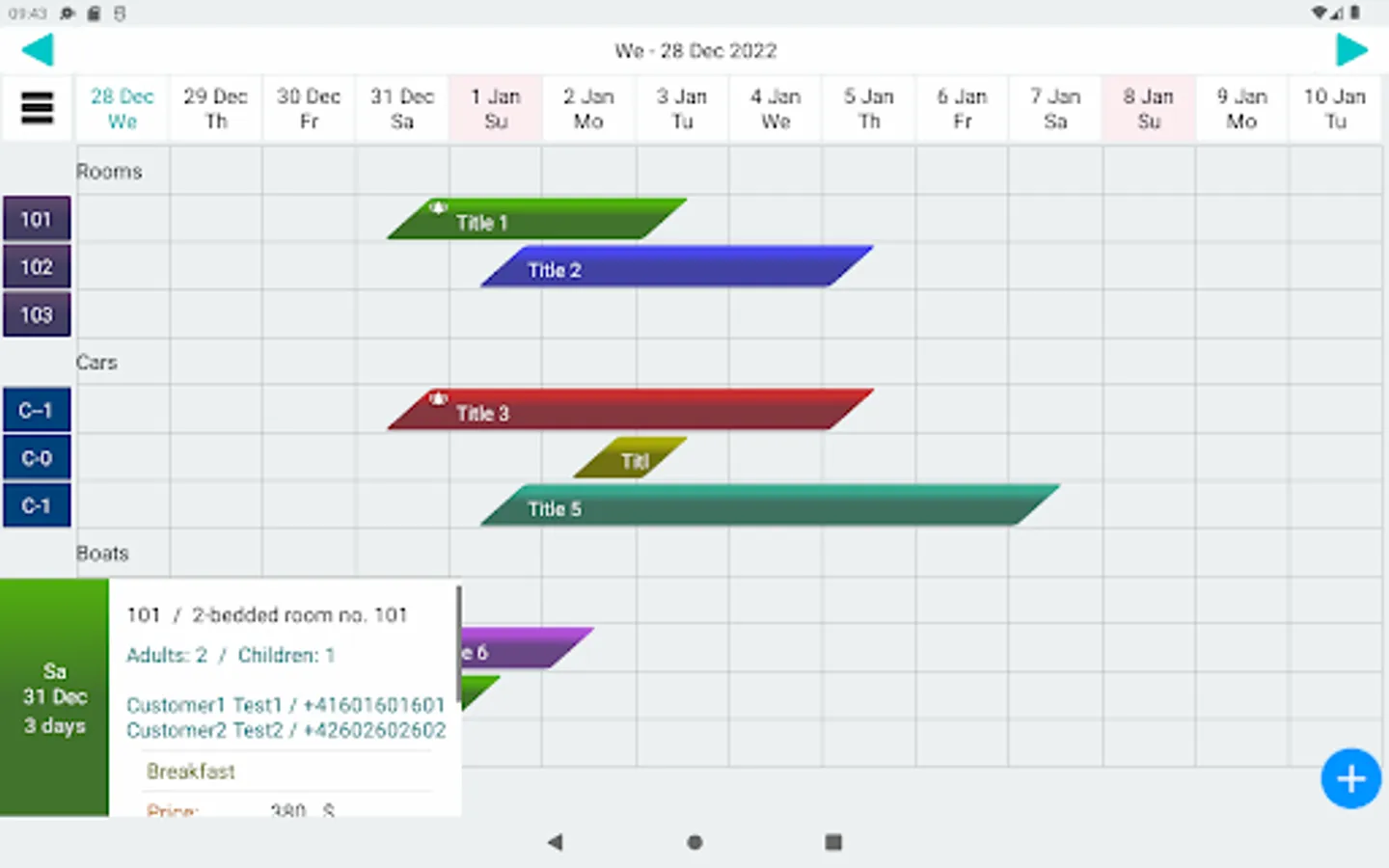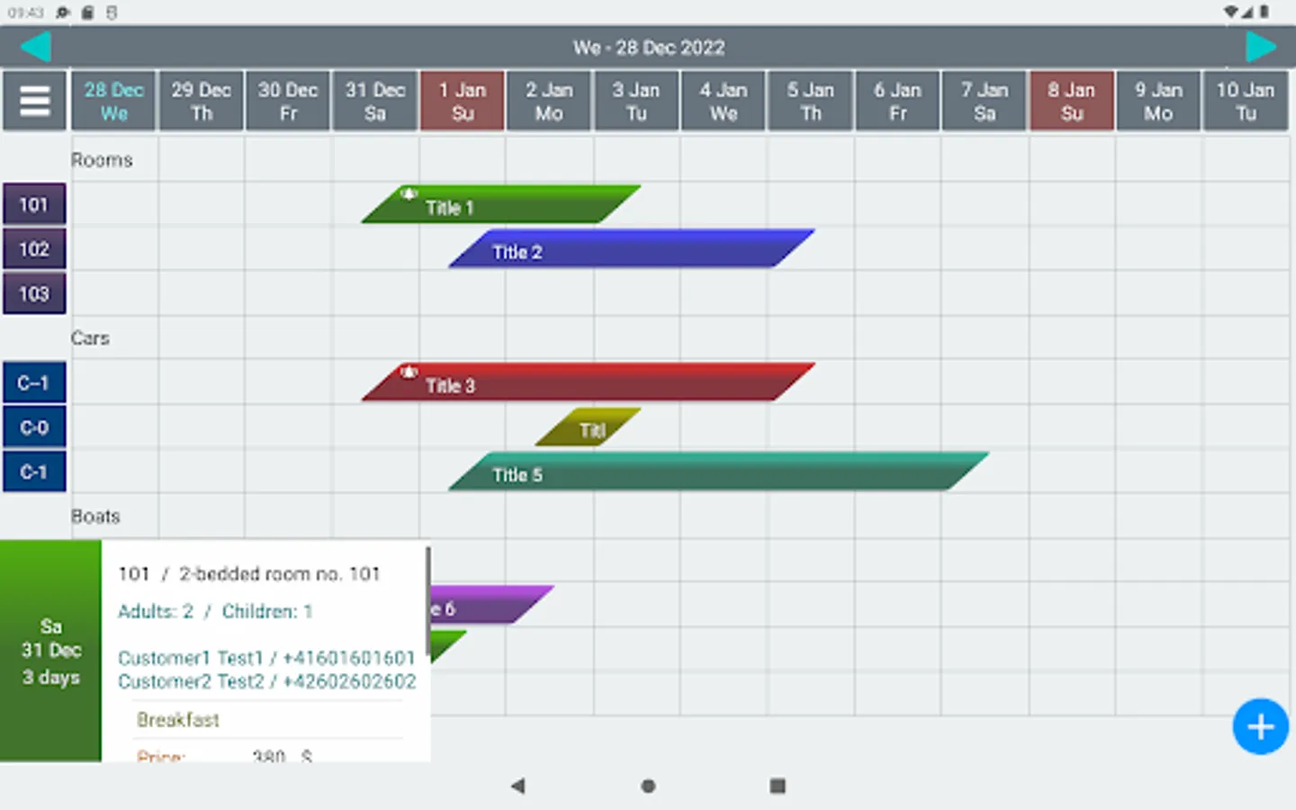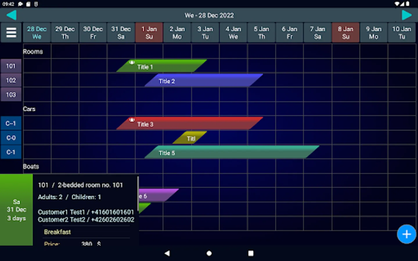 Business system to manage customer reservations/booking for hotel, pension car rental, hire service etc. . Data presentation prepared especially for small and large touchscreens. Easy management of customer groups, own reservable resources/services (like hotel room, cars for hire etc.).