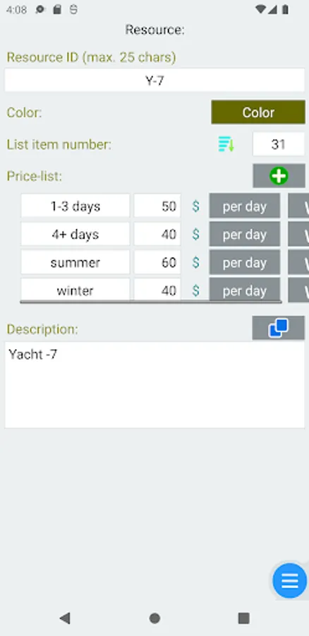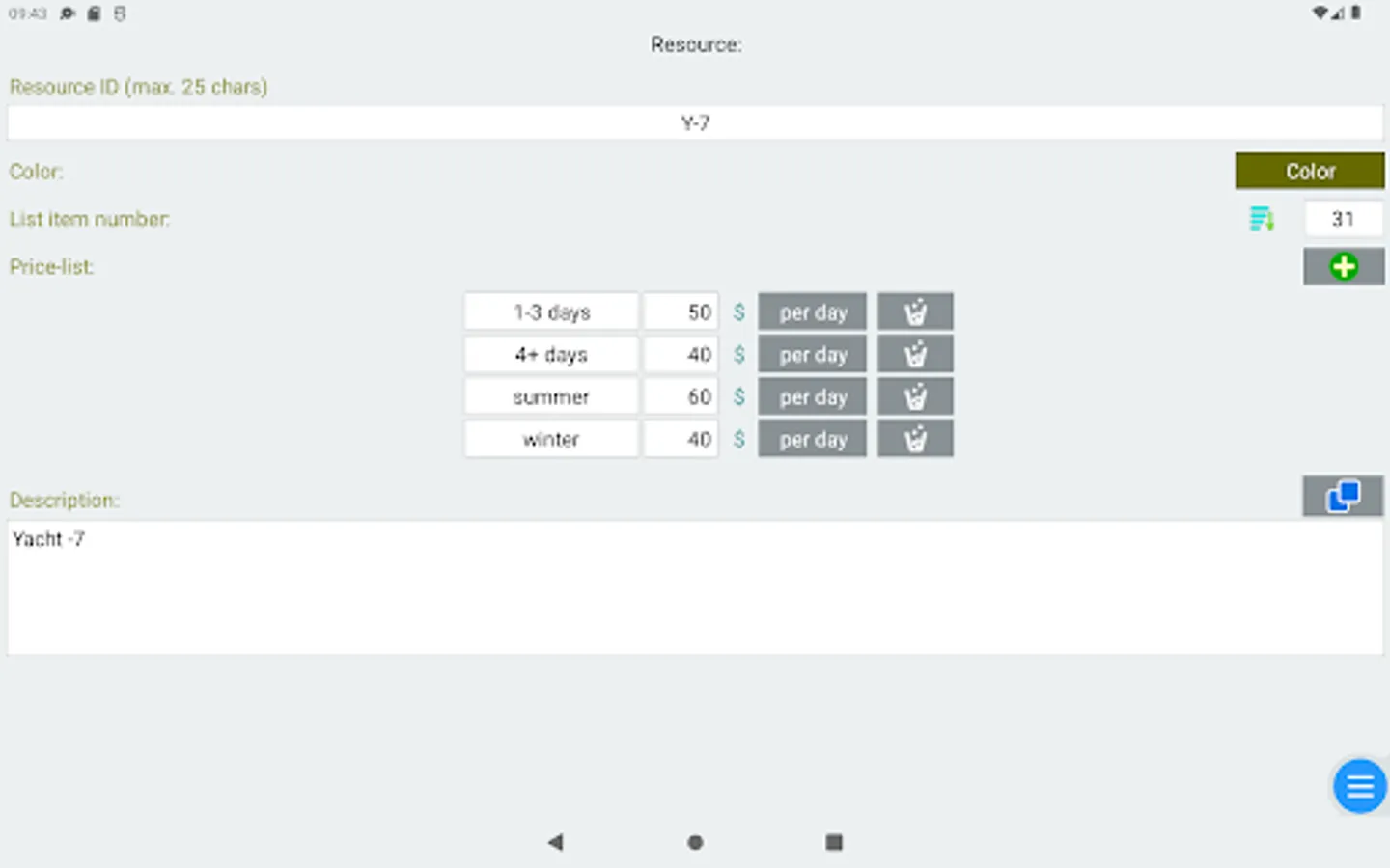 - resources management: (ex. room, car) in servie/out of service, description and note,