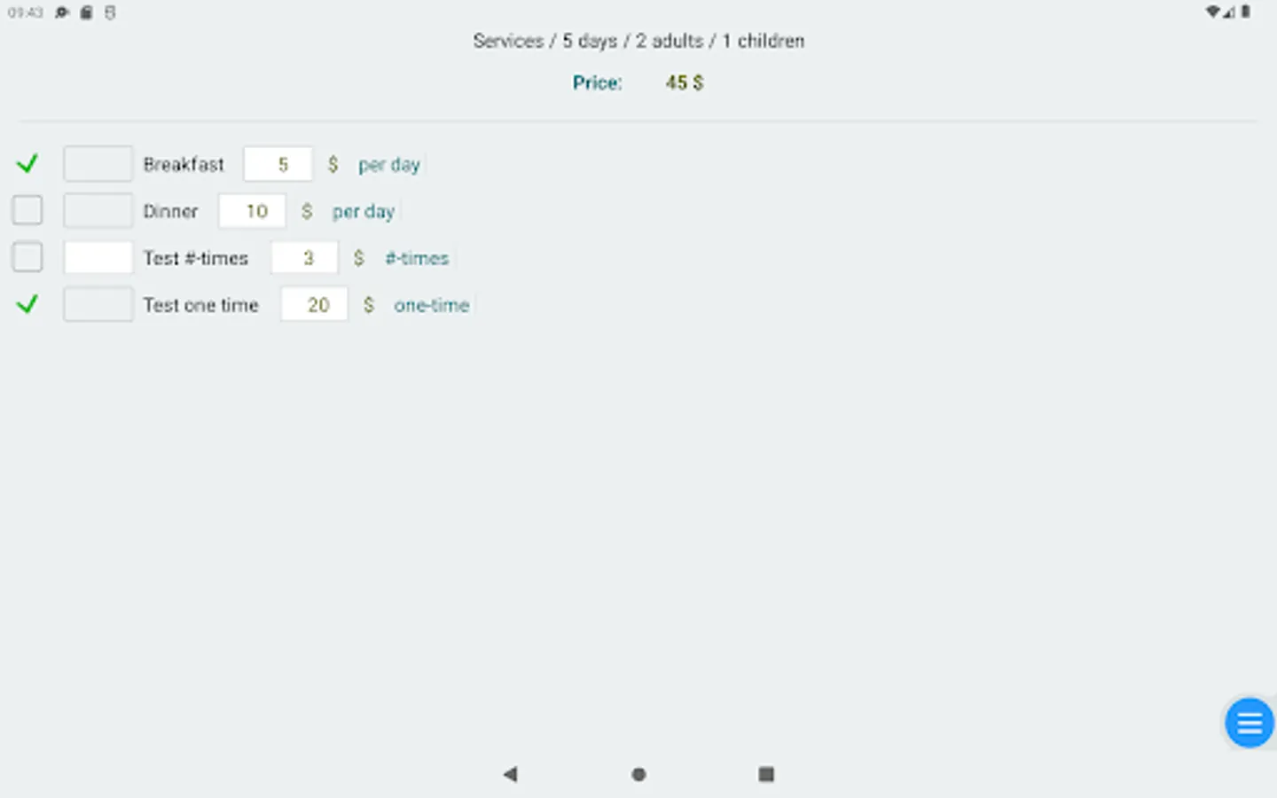 - two reservation/booking modes: from-to midnight or from-to part of the day.