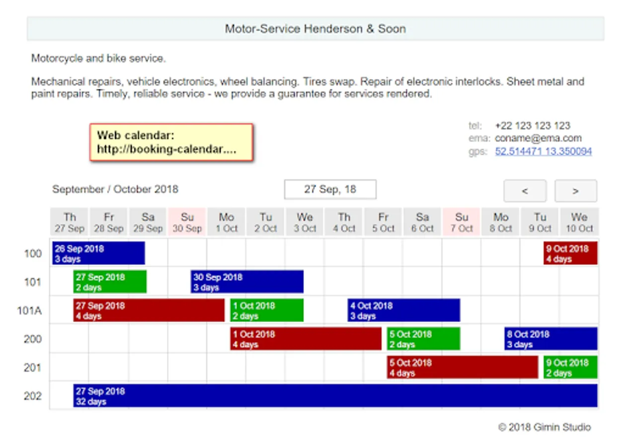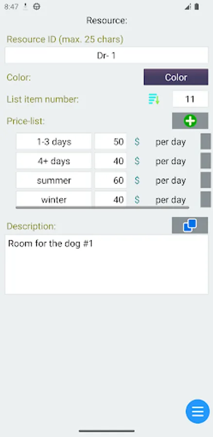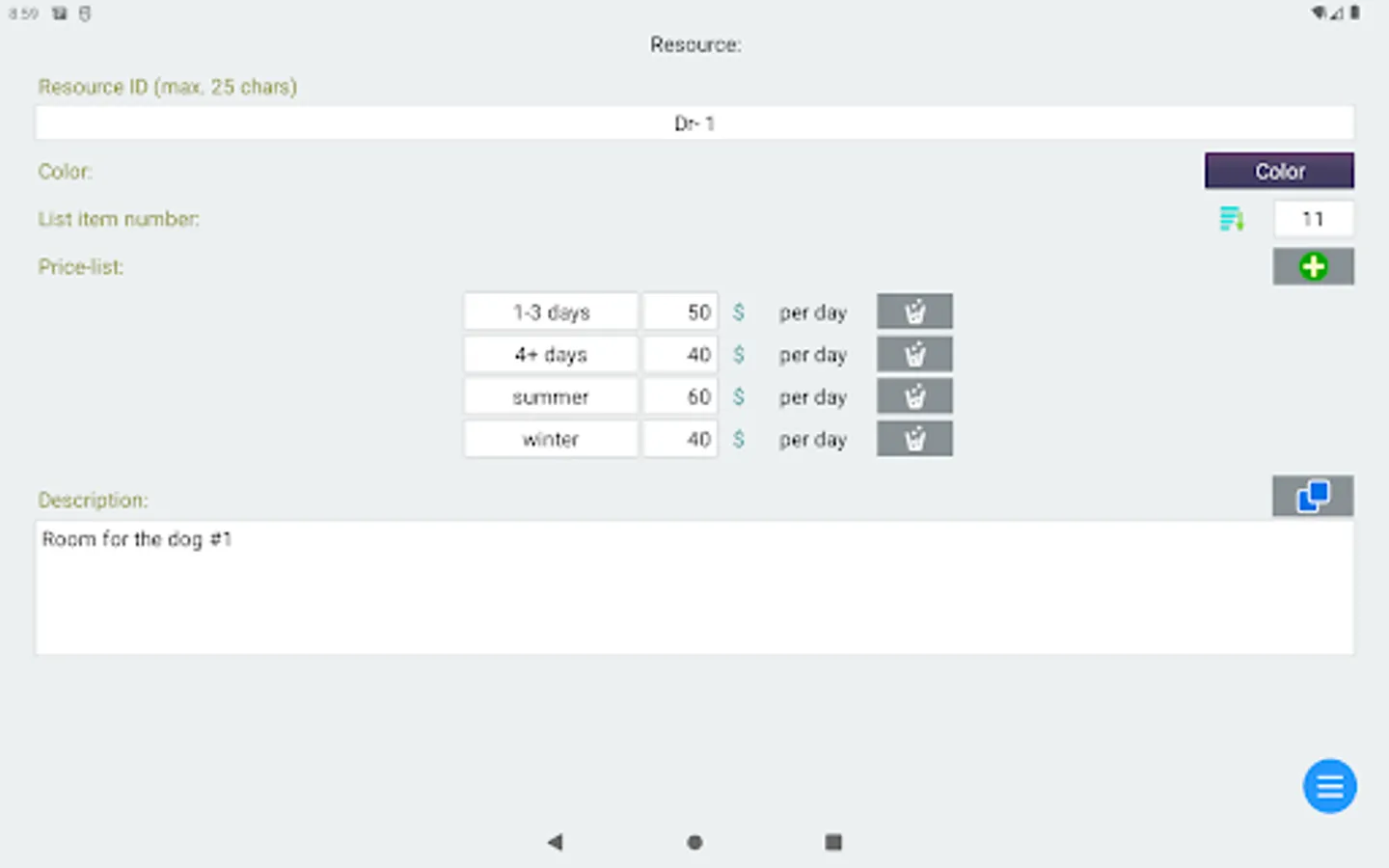- resources management: (ex. room, car) in servie/out of service, description and note,
