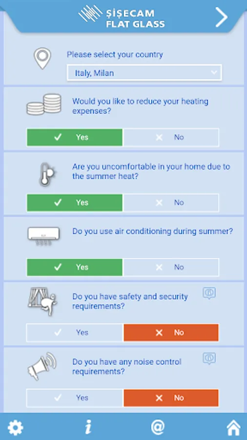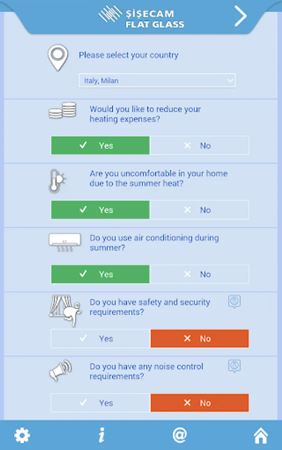 With ‘’Right Glass’’ , you can easily choose the most appropriate Insulating Glass Unit for your home by answering a few questions. Glass recommendations are provided according to your answers in terms of heat and / or solar control, noise control, safety and security requirements.