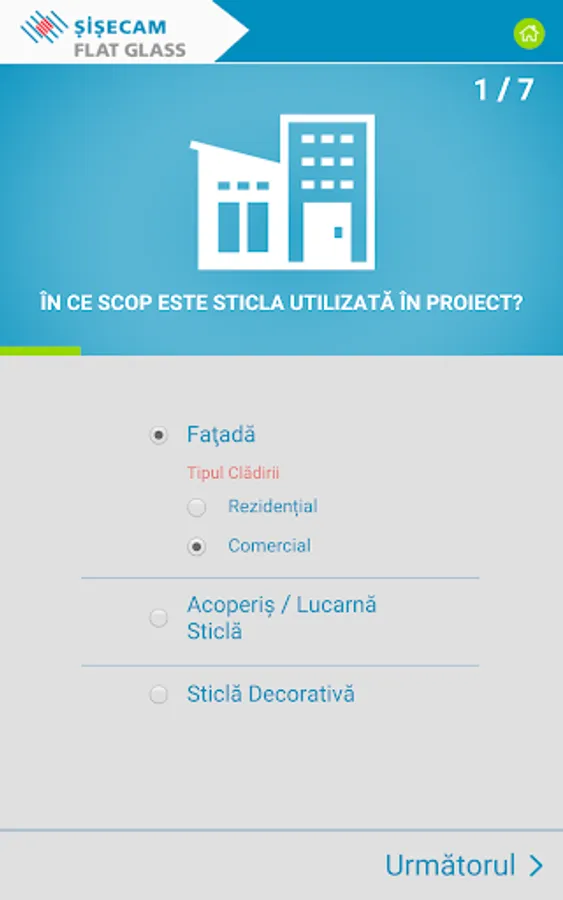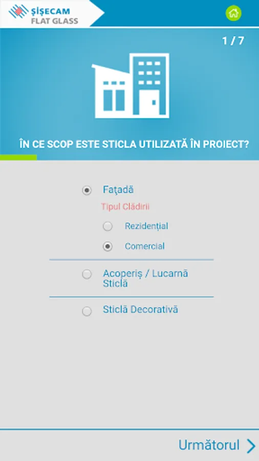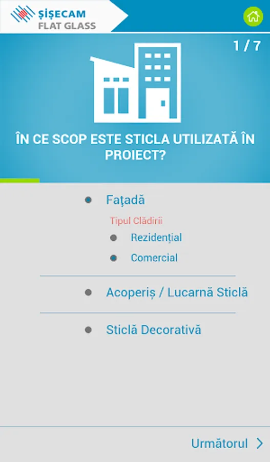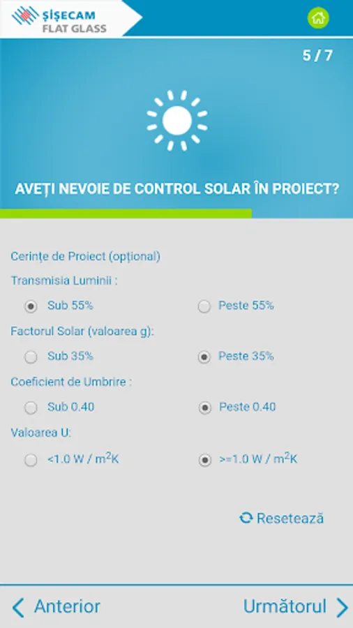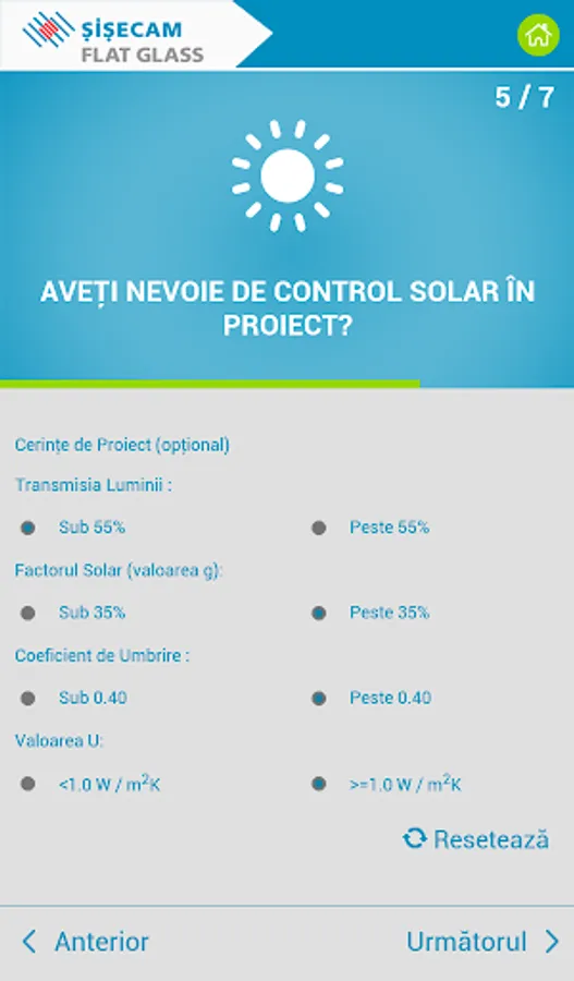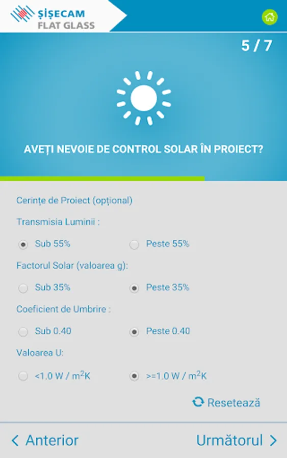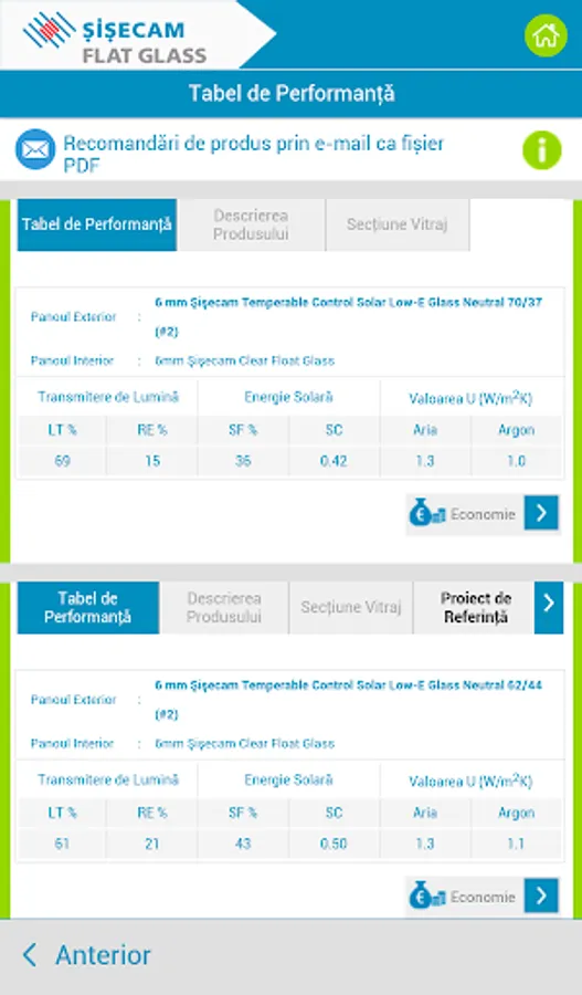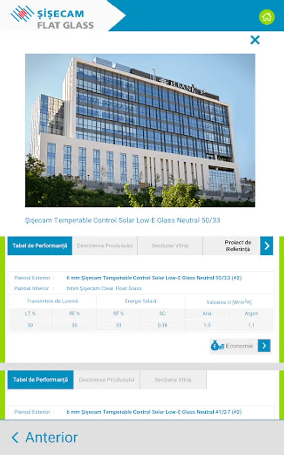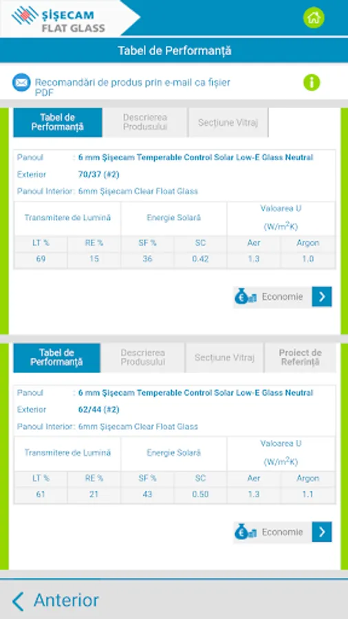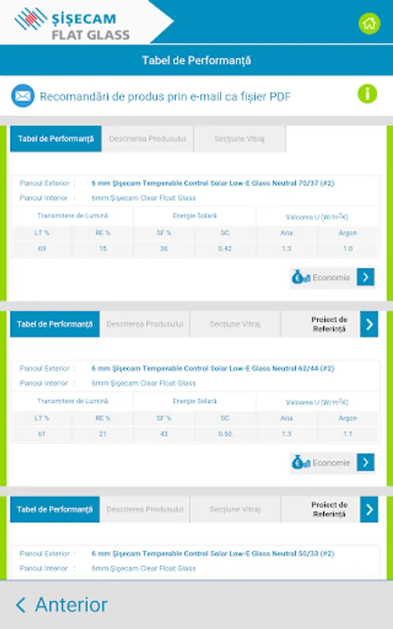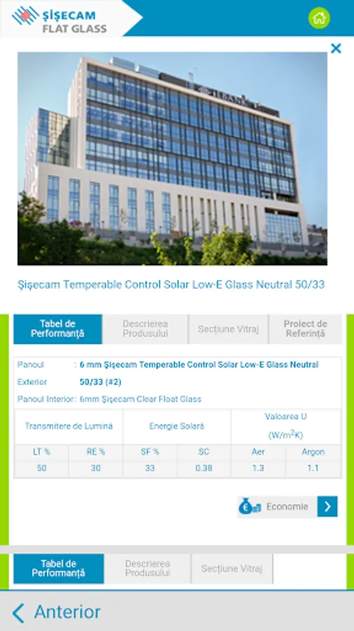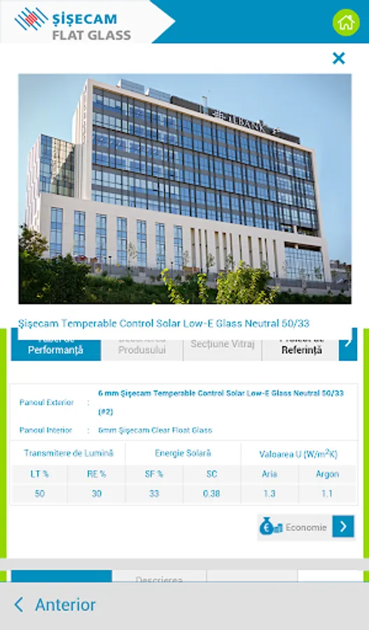 Recomandările pentru sticlă sunt furnizate în funcție de răspunsurile dvs. în ceea ce privește controlul energiei termice și / sau solare, controlul zgomotului, cerințele de siguranță și securitate. Pe lângă recomandările pentru soluția de sticlă potrivita puteți vedea și economiile de energie la încălzire și răcire pe an și pe întreaga durată de viață a clădirii.