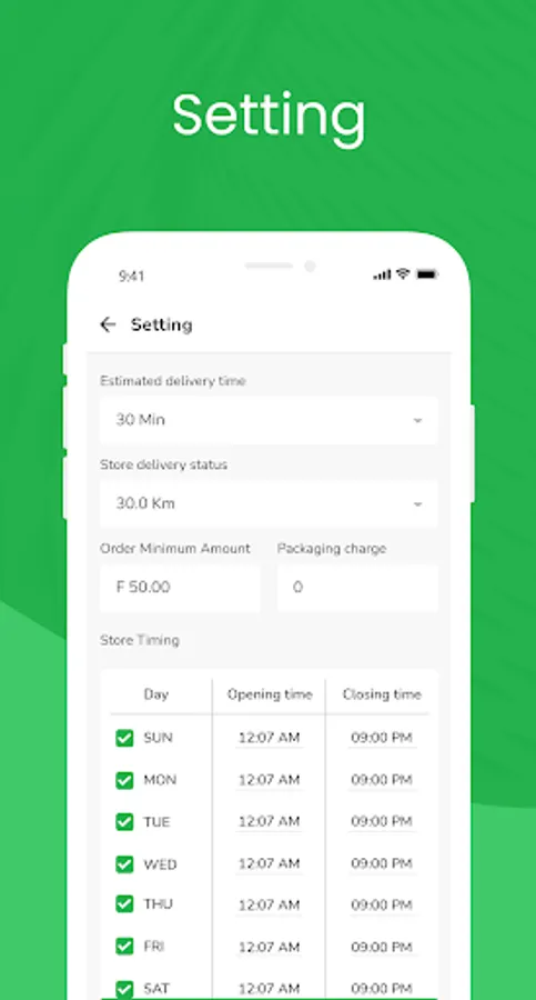 -Manage store details like store time, manage product status, packaging charge, delivery radius, minimum order amount, Estimated delivery time, and more