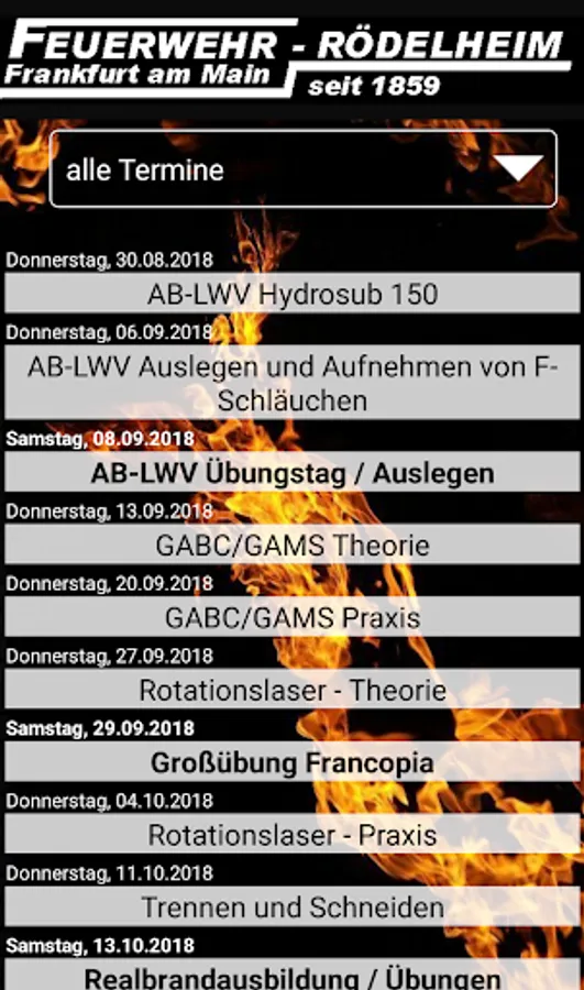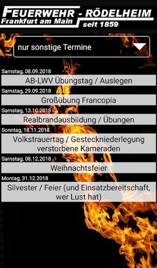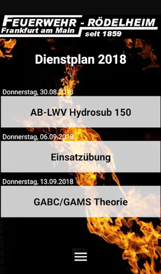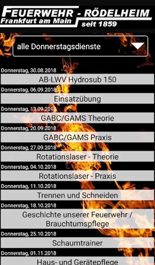 Roster of the Frankfurt am Main Rödelheim volunteer fire brigade. Displays the next three services, clicking on the service shows the person responsible. There is the possibility to display all services for the year, other dates or the inner city readiness.