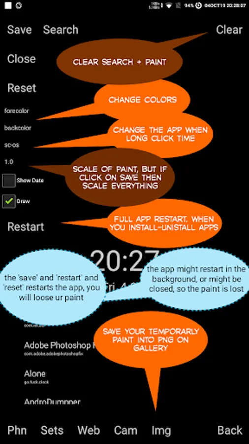 If you want to change scale of paint temporarly, change the 'scale' value on 'edit', if you click save, you will loose your painted, and all labels, shortcuts, time, date will be scaled.You can also change colors ! But only one color paint at a time ...