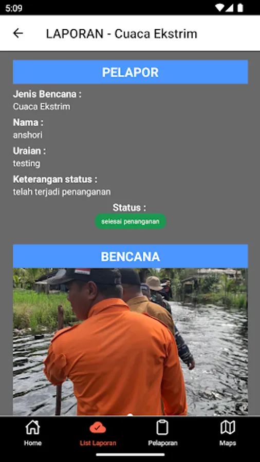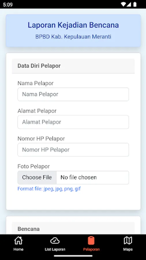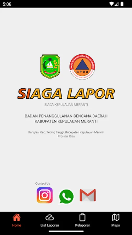 This application is called Siaga Report which was made by BPBD Meranti Islands Regency. The Siaga Report application is used to report disaster events in Meranti Islands Regency by the general public and can also display disaster status.