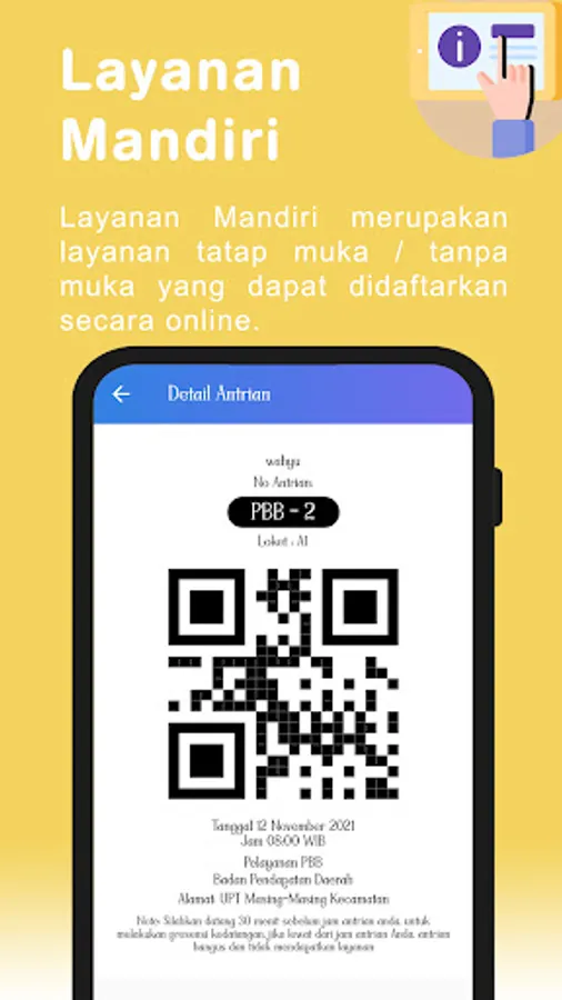 The Self Service feature was developed by the Tangerang Regency Communication and Information Office to make it easier for the Tangerang Regency community to carry out independent services, such as online queues, ID cards processing, Tax management, Licensing and other independent services.