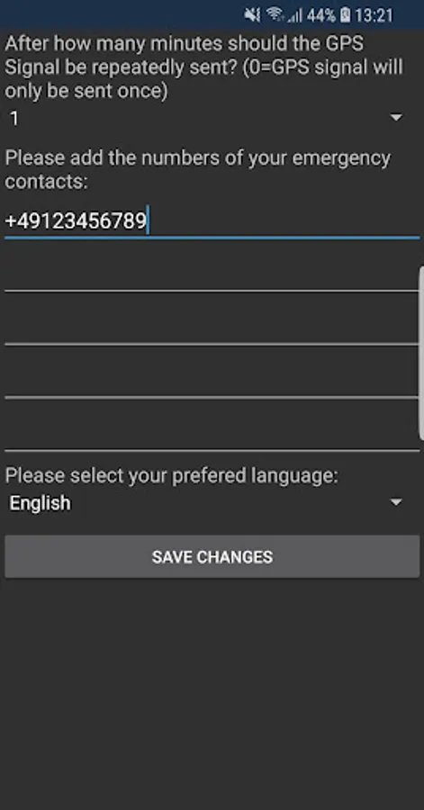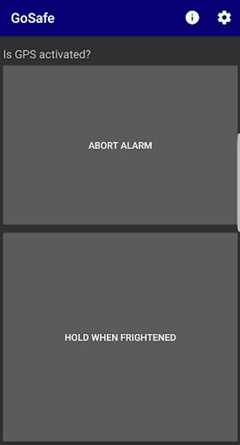 If you feel insecure, just open GoSafe and keep the button titled "Hold when frightened" pressed. The momend you let go, a Countdown of 20 seconds will start. If you don't abort the Alarm within the timespan, your location will be sent to your selected contacts via SMS. If wanted, the location can also be sent repeteadly.