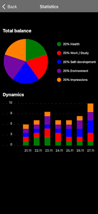 Health, self-development, environment, personal life, work/study, impressions, spiritual development, social activity, or create your own category.