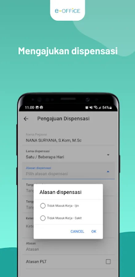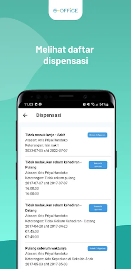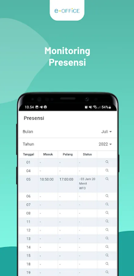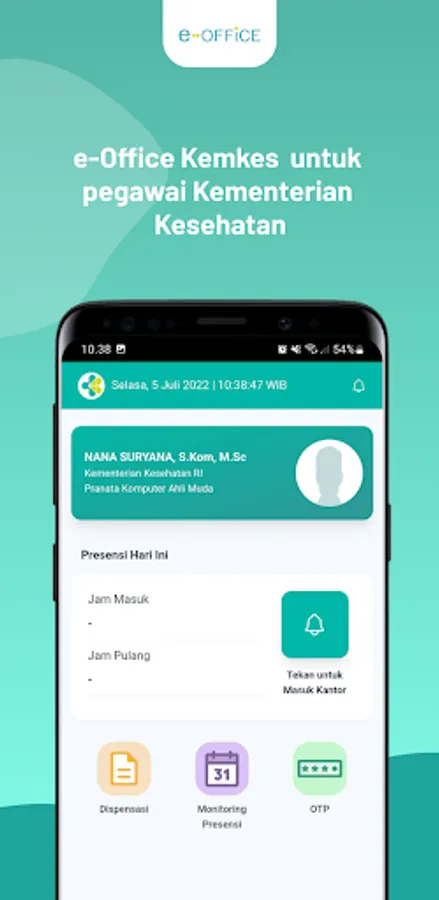 The Ministry of Health's e-Office application is a digital office administration management application for employees within the Ministry of Health. This application contains features including staffing profiles, as well as attendance recording features from various locations of the Ministry of Health based on GPS Location and Face Recognition.