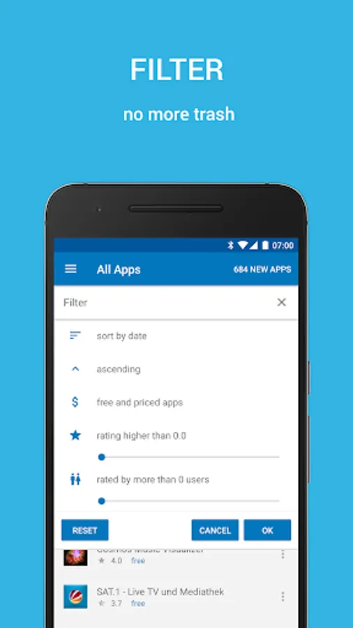- sort apps by adding time, name, rating and price