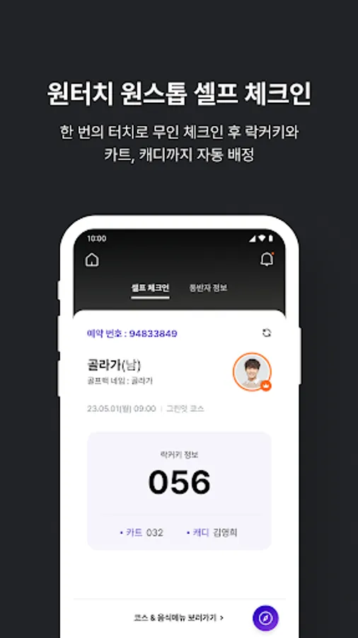 - 라운드 당일 데스크 방문없이 앱에서 셀프 체크인하고 모바일에서 바로 락카를 배정받으실 수 있어요.