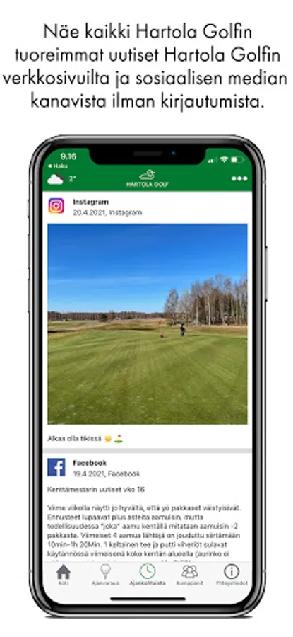 In the app you will find all the latest news on Hartola Golf's website and all social media channels. You can follow these channels without social media credentials and without signing in. You will also receive push notifications from all the news if you wish and stay up to date. The app also has the option to sign up for a NexGolf appointment.