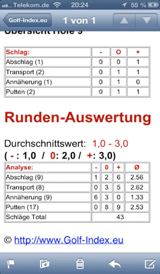 A three stage self-assessment of each shock is the core of the analysis and will have to be issued in addition to the pitch length after each blow. This applies to the discount, the transport and approach shots and puts. At each blow observations can be made. The analysis evaluation, in which can be changed any time, shows the sum of all strokes and the average quality of the waste, transport and approach shots and puts. Now is easy to see what are the weaker beats and down require more attention in training immediately ...