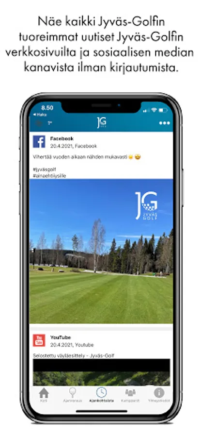 In the app you will find all the latest news on Jyväs-Golf's website and all social media channels. You can follow these channels without social media credentials and without signing in. You will also receive push notifications from all the news if you wish and stay up to date. The app also has the option to sign up for a NexGolf appointment.