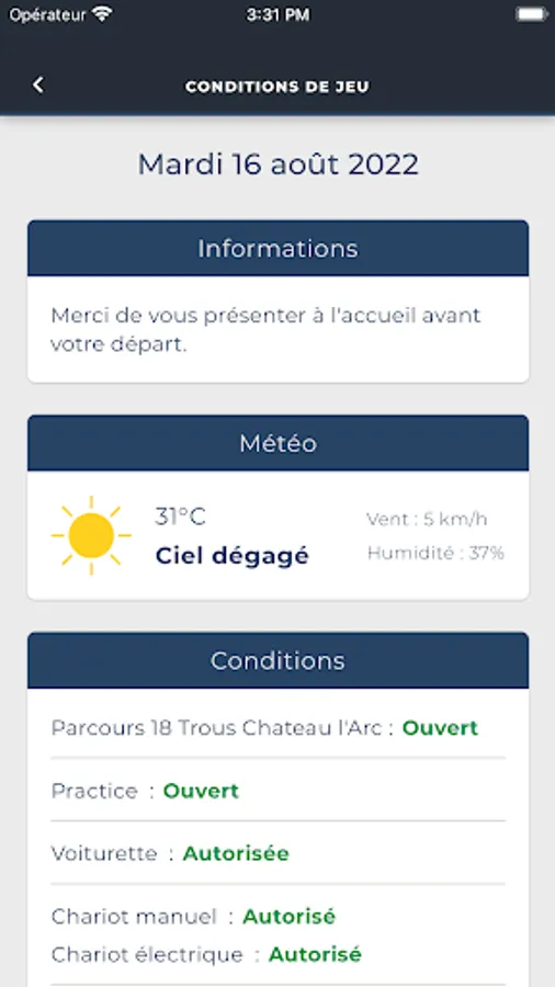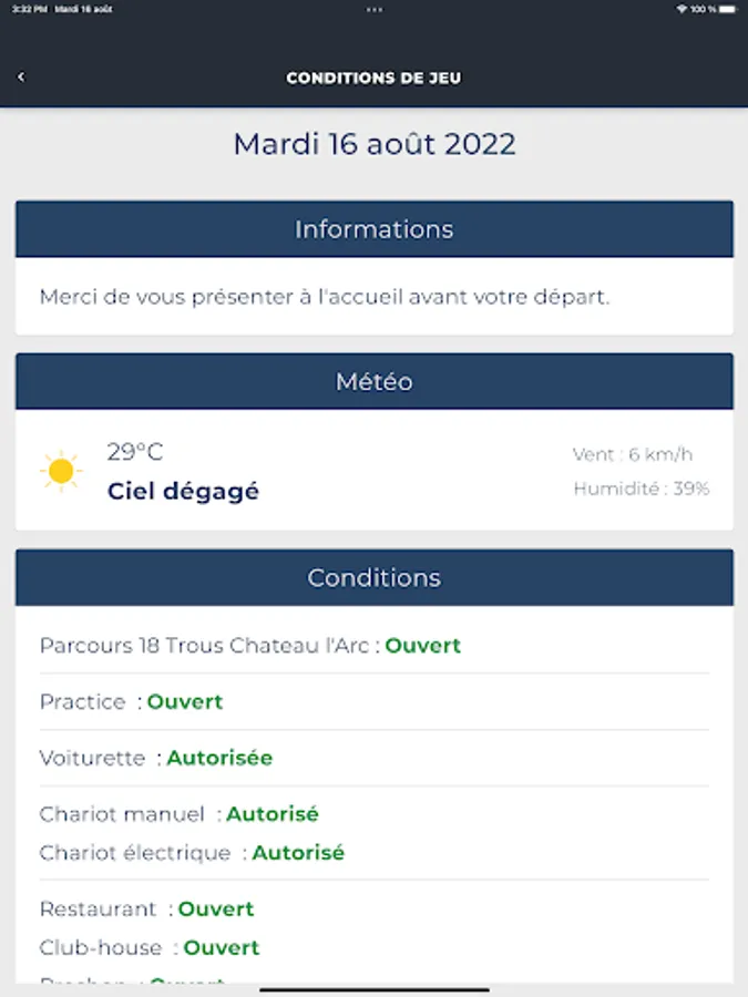 Download the App. of your Golf which allows you to access a panel of services with ease and join thousands of golfers who, like you, are looking for an application to book a tee, register for a competition, consult the tee times and the results of competition, subscribe or re-subscribe, reload your practice card ... Access all the services of your golf course in a few clicks and take full advantage of your visit without any constraints!