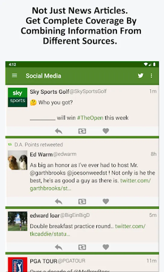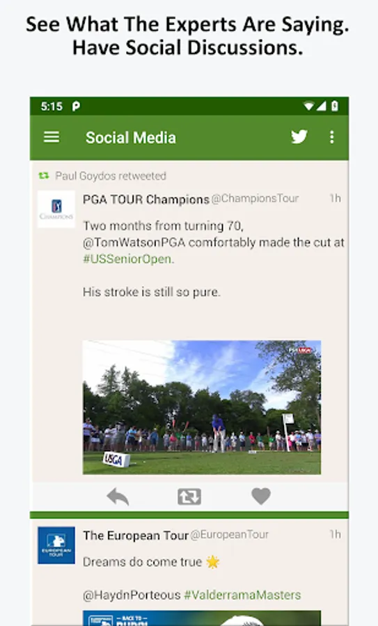 -- Discussion feed that aggregates players, tours, and personalities from the Golf world into a single list of tweets, so you can hear what everyone has to say and respond to them in real-time.