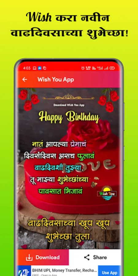 आता आपल्या प्रियजनांना वाढदिवसाच्या शुभेच्छा तसेच सणाच्या शुभेच्छा देत राहा, त्यांची आठवण काढत राहा. ह्या शुभेच्छा तुम्ही टेक्स्ट आणि HD इमेज फॉरमॅट मध्ये पाहू शकता, डाउनलोड करू शकता आणि तुमच्या मित्र मैत्रिणींसोबत शेअर करू शकता..