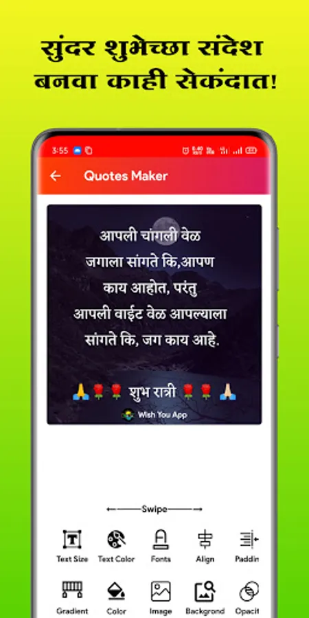 Wish You, Good Morning Friends! If you are looking for a Good Morning Marathi Message or good night Marathi status, then Wish You app is best for you. Here you can find the top-picked Shubh Sakal Marathi Images with high-definition (HD) quality. This app also gives you the feature to edit any quotes with your own texts called Quotes Maker.