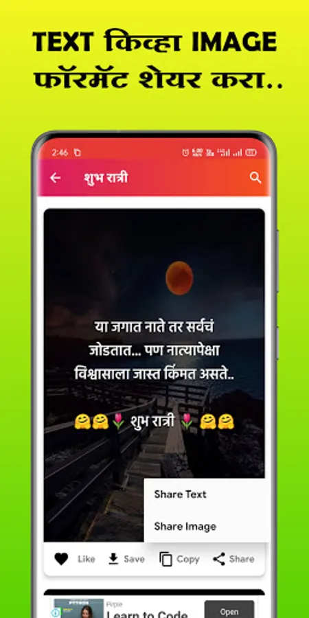 Wish You, Good Morning Friends! our Marathi status or Marathi quotes app is India's famous app where you can find 1000+ Marathi status on love, Marathi jokes, or Marathi status for WhatsApp. wish you app Marathi is the one and only wishing app in many Marathi wishes apps that always update fresh images and Marathi status each hour.
