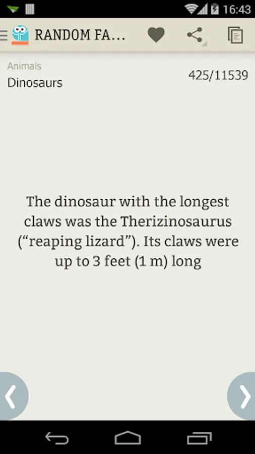 Use swipe gestures or arrows to navigate through facts. Get random facts and share them with friends!