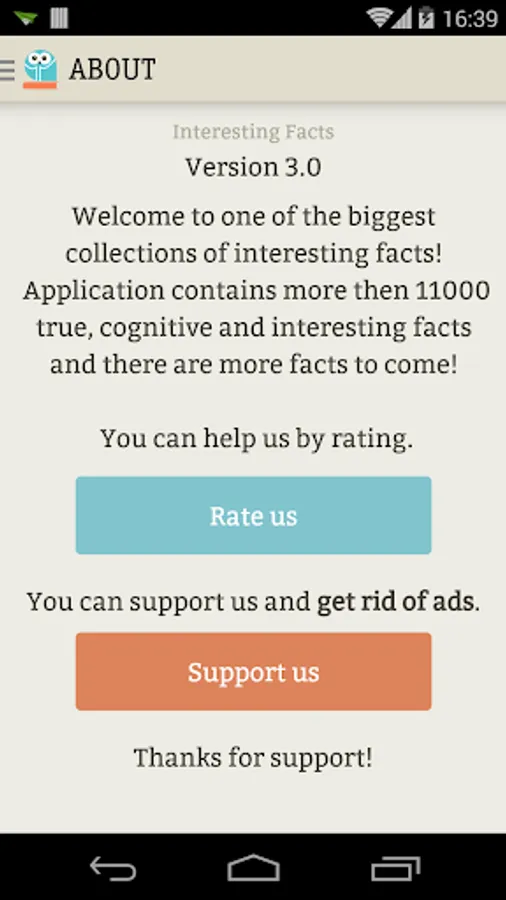 Welcome to one of the biggest collection of interesting facts! Application contains more then 12000+ true, cognitive and interesting facts and there are more facts to come!