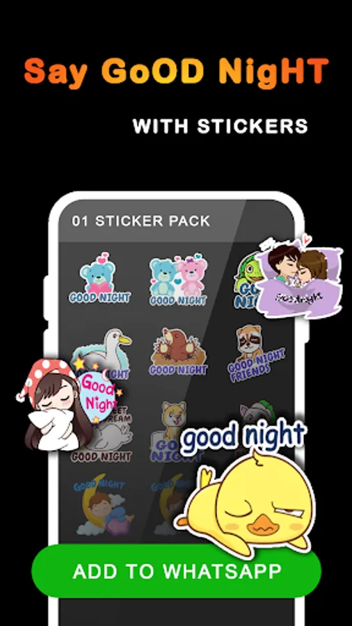WAStickerapp contain several stickers collection for good night like good night emojis, good night love images, good night messages, good night blessing stickers, moon stickers, sleeping baby stickers, girl sleeping stickers etc.