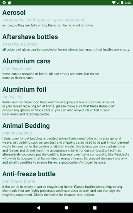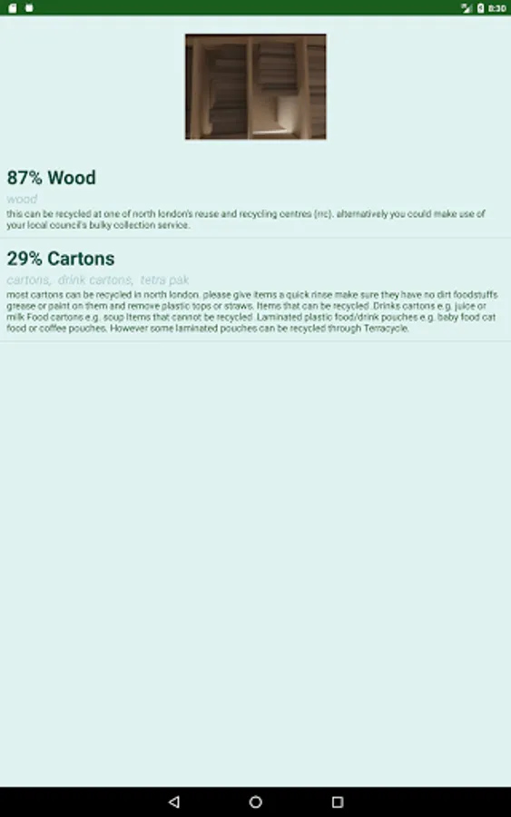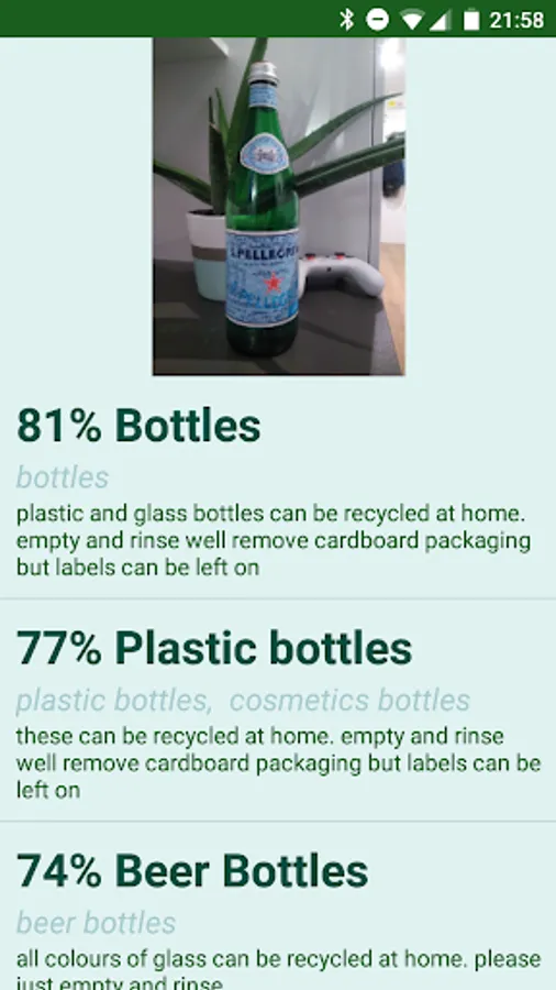 In the Camera view it first goes to the phone's camera to take a picture. Once the picture has been taken the app gives possible items in the picture and how to recycle them.
