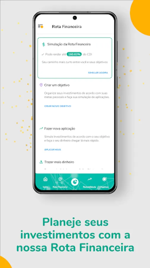 When you open your digital account in our digital bank, you can count on the technology of our investment robot to discover the best options for your money to yield more: CDB, Investment Funds and Shares.