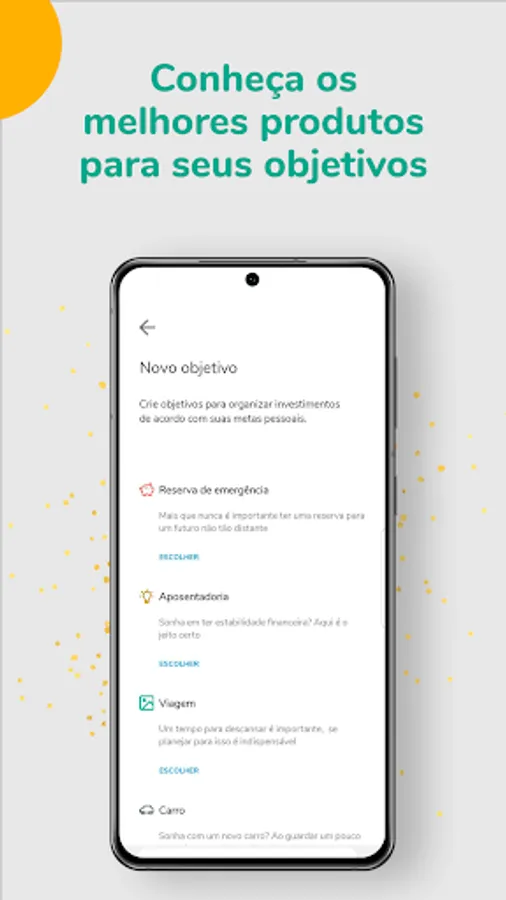 Invest in CDB, LCA, LCI and Investment Funds such as Fixed Income Funds, Shares, Multimarket Funds, Share Funds, or Exchange Funds, depending on your objectives.