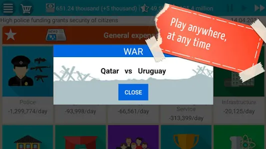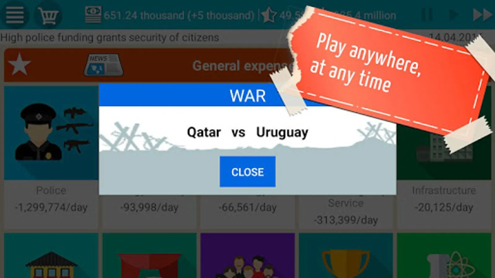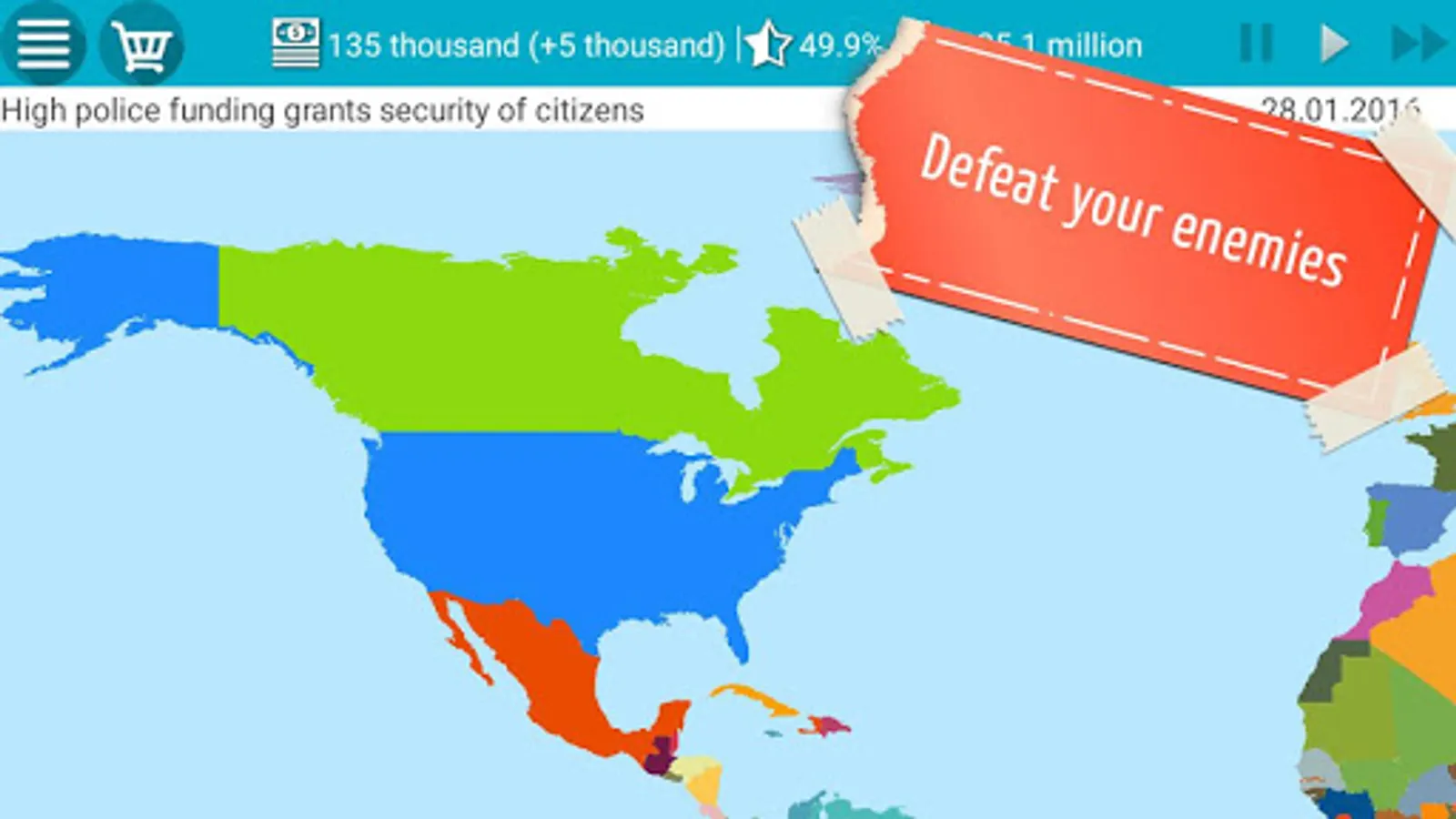 Are you sure? Prove it! The "President Simulator" game lets you rule one of the 163 modern countries. Politics, the media, espionage, natural disasters, wars, taxes, crime fighting… Show your strength, wisdom and perseverance. Build a superpower that dictates its rules, otherwise the world will smash your country.